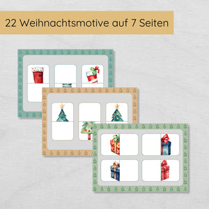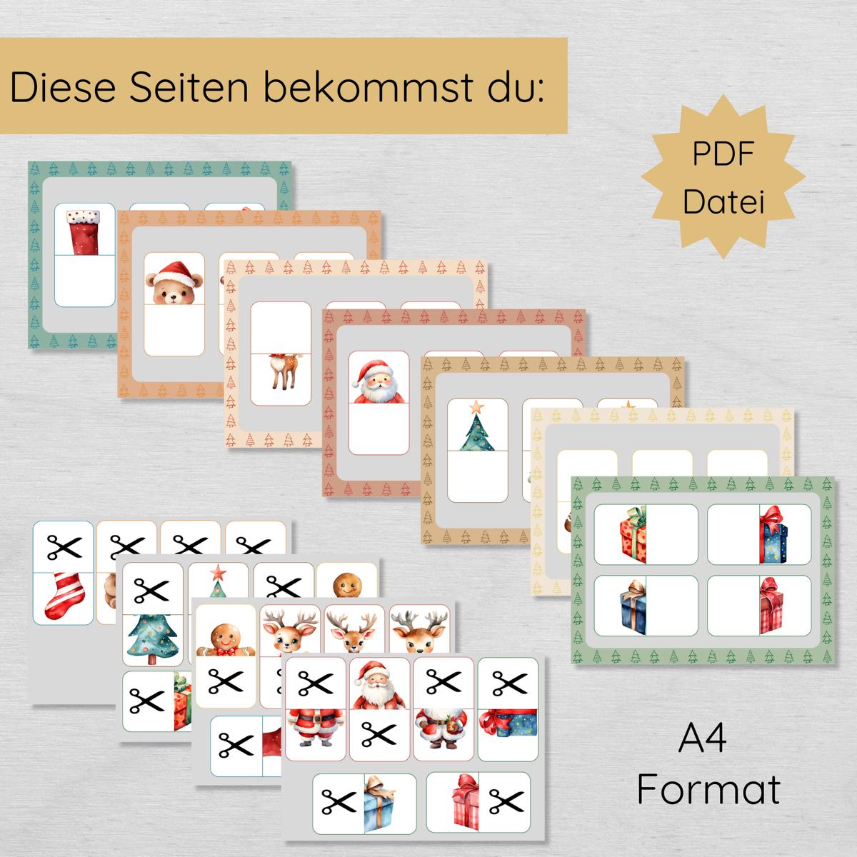Erlebe mit unserem Weihnachtspuzzle eine unterhaltsame und lehrreiche Aktivität für die Vorweihnachtszeit! Auf 7 Seiten warten liebevoll gestaltete Motive wie Weihnachtsbäume, Geschenke und Rentiere darauf, wieder komplett zusammengesetzt zu werden. Jedes Bild ist in zwei Hälften geteilt, sodass dein Kind die richtige Hälfte suchen und einfügen muss.