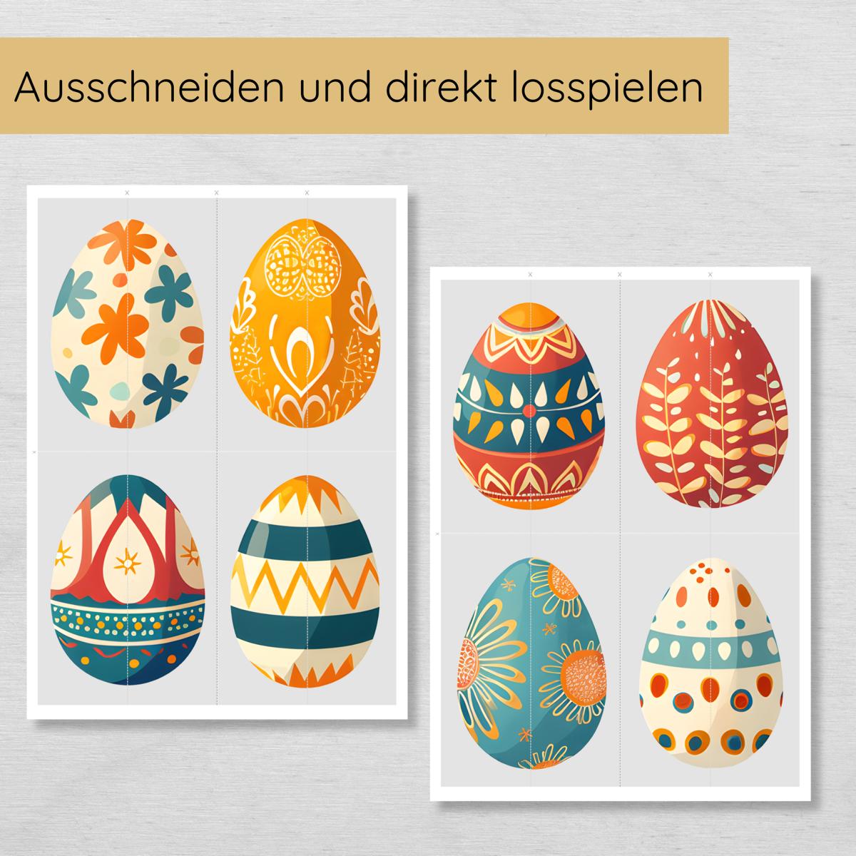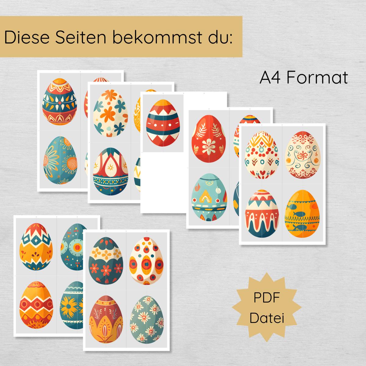 - PDF mit 7 Seiten: 25 Osterei-Hälften zum Ausschneiden und Puzzeln