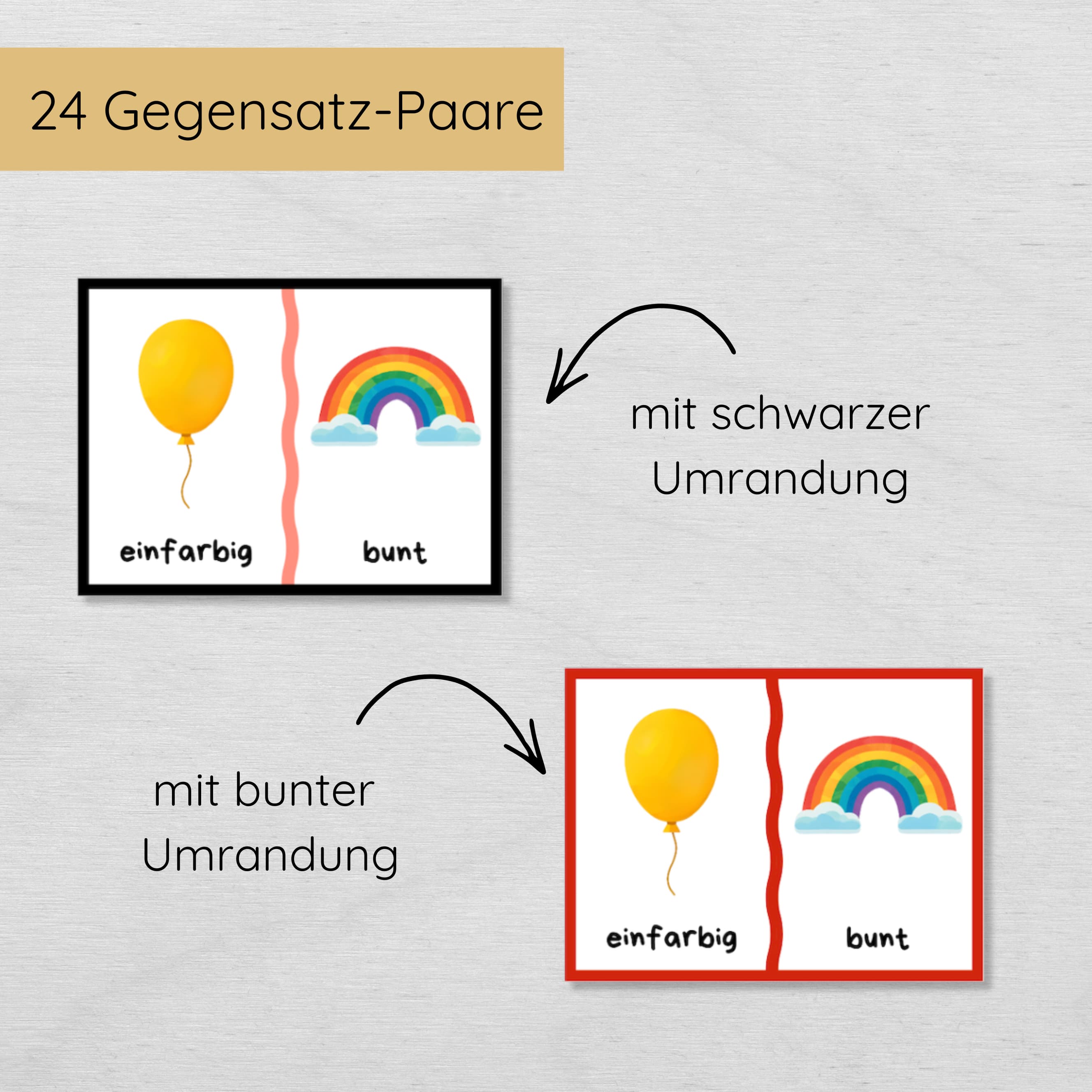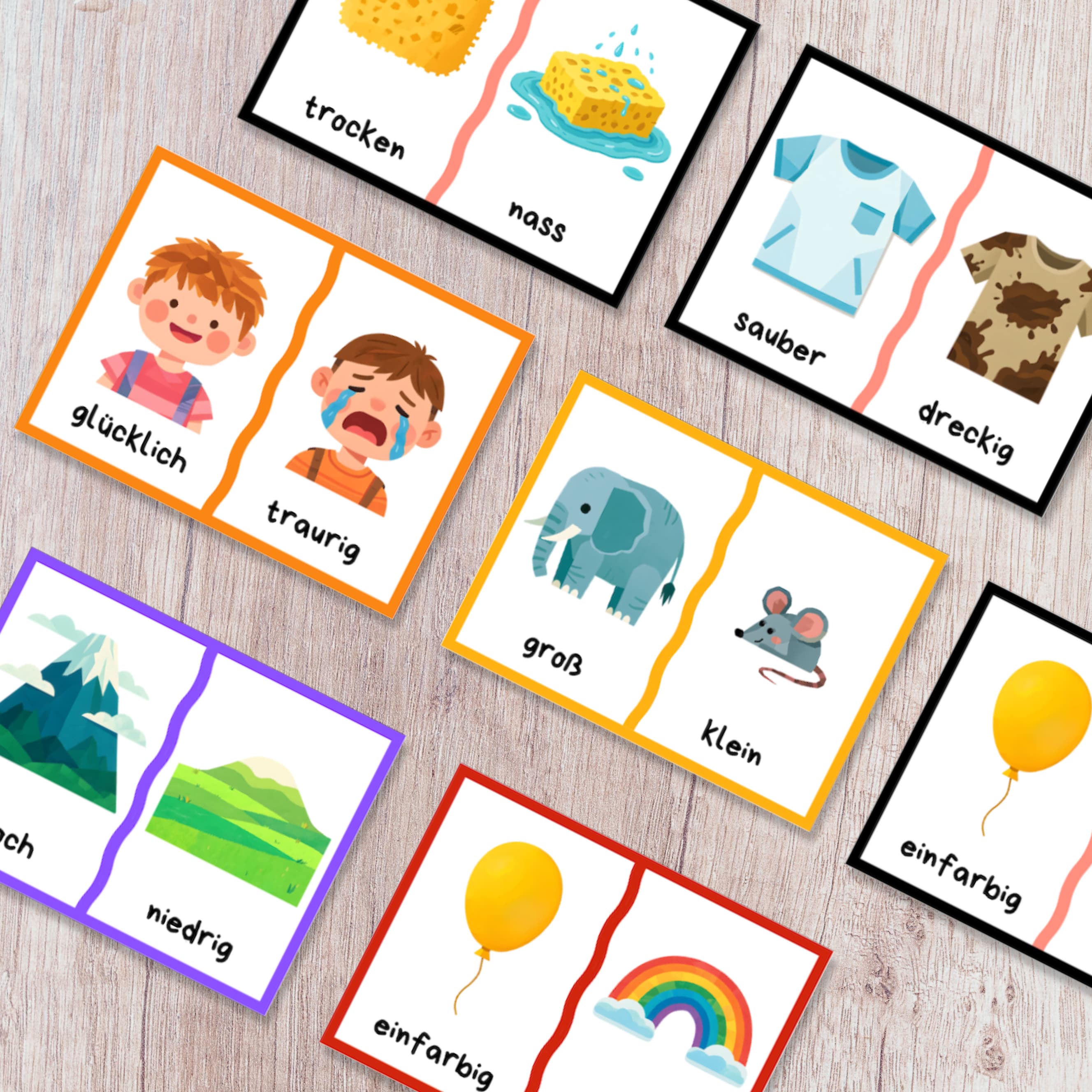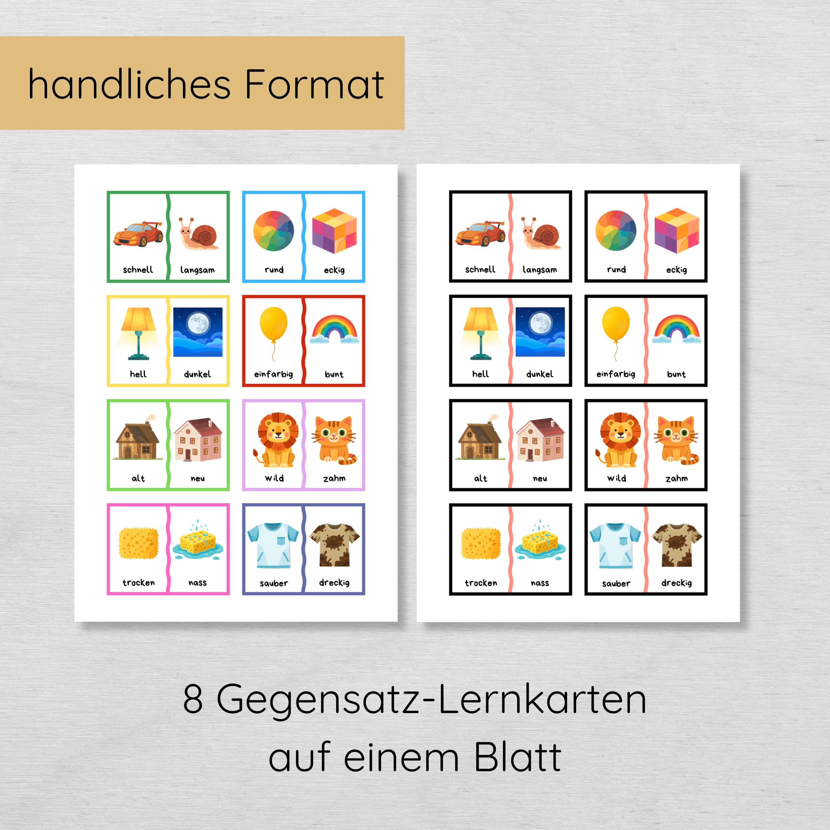 Gegensätze Lernkarten für Kinder – 24 Paare in 2 Farbvarianten