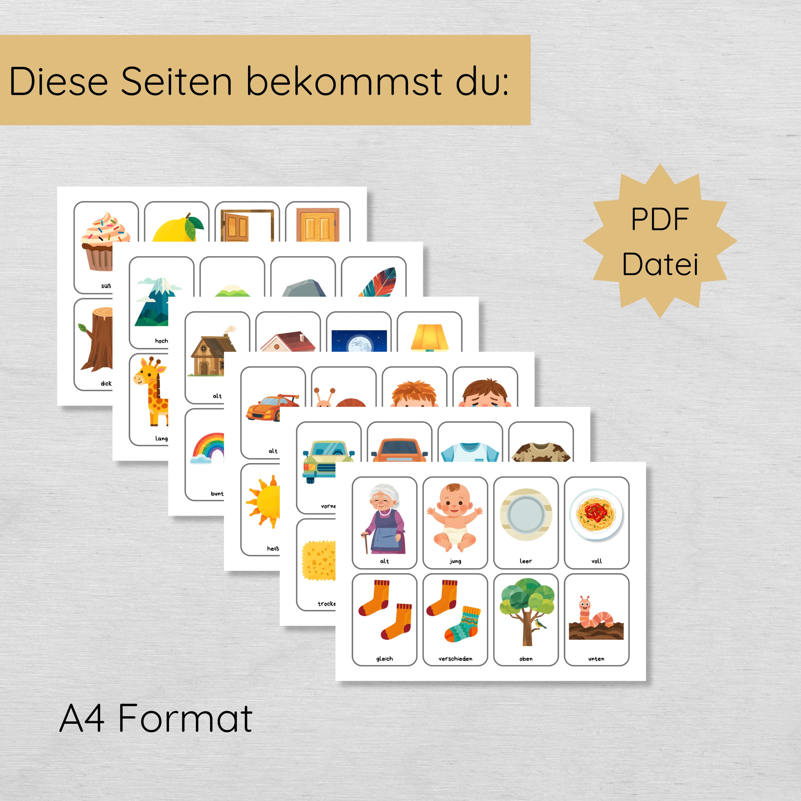 Diese Gegensätze Lernkarten verbinden Spiel, Spaß und gezielte Sprachentwicklung – einfach, durchdacht und alltagstauglich.
