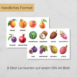 - 30 Obstkarten mit klaren, farbenfrohen Illustrationen und Obstnamen (z. B. Apfel, Kiwi, Mango etc.)