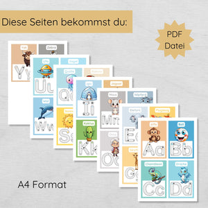 - Interaktives Lernen: Jede Karte zeigt einen Buchstaben des Alphabets als Groß- und Kleinbuchstabe sowie eine passende Illustration, die den Buchstaben visualisiert. Kinder sollen die Buchstaben nachspuren, wodurch sie ihre Schreibfähigkeiten trainieren und verbessern.