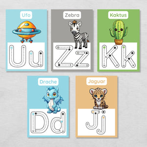 Mach das Schreibenlernen für dein Kind zu einem spannenden Erlebnis mit unseren Alphabet Übungskarten! Diese 26 Karten bieten eine unterhaltsame und effektive Möglichkeit, das Alphabet zu entdecken und die ersten Schreibfähigkeiten zu entwickeln.