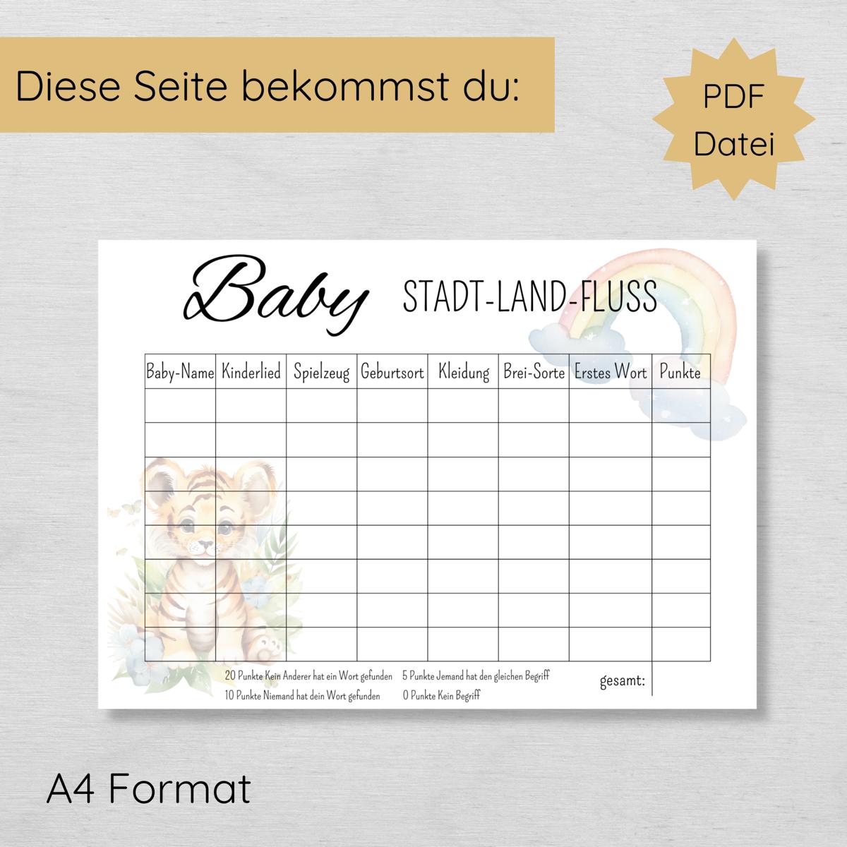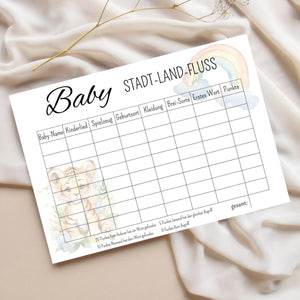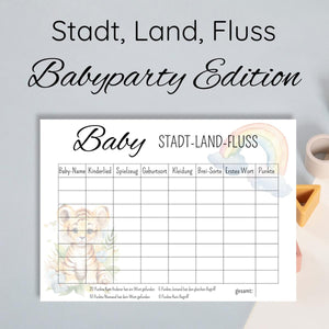 Mach deine Babyparty zu einem unvergesslichen Erlebnis mit der Stadt Land Fluss – Baby Edition! Dieses kreative und unterhaltsame Spiel bringt frischen Wind in jede Feier und testet das Babywissen deiner Gäste auf spielerische Weise.