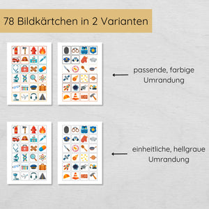 Du erhältst ein umfangreiches Set mit 13 verschiedenen Berufen und 78 passenden Bildkarten in zwei Varianten: eine Version mit farbiger Umrandung erleichtert jüngeren Kindern die Zuordnung durch visuelle Orientierung und eine Version mit neutraler grauer Umrandung. Diese anspruchsvollere Variante ohne Farbhilfe eignet sich perfekt zur Steigerung oder für ältere Kinder.