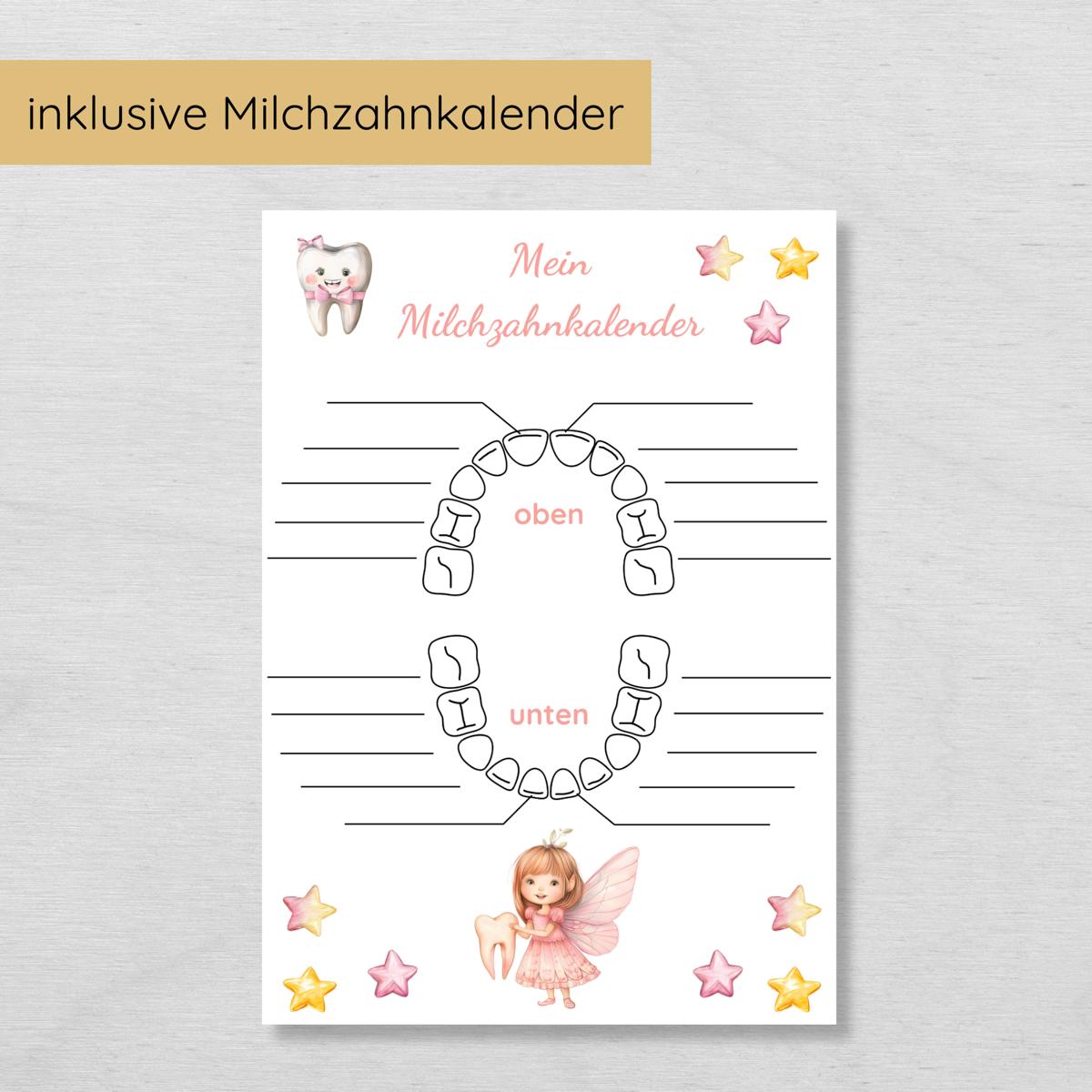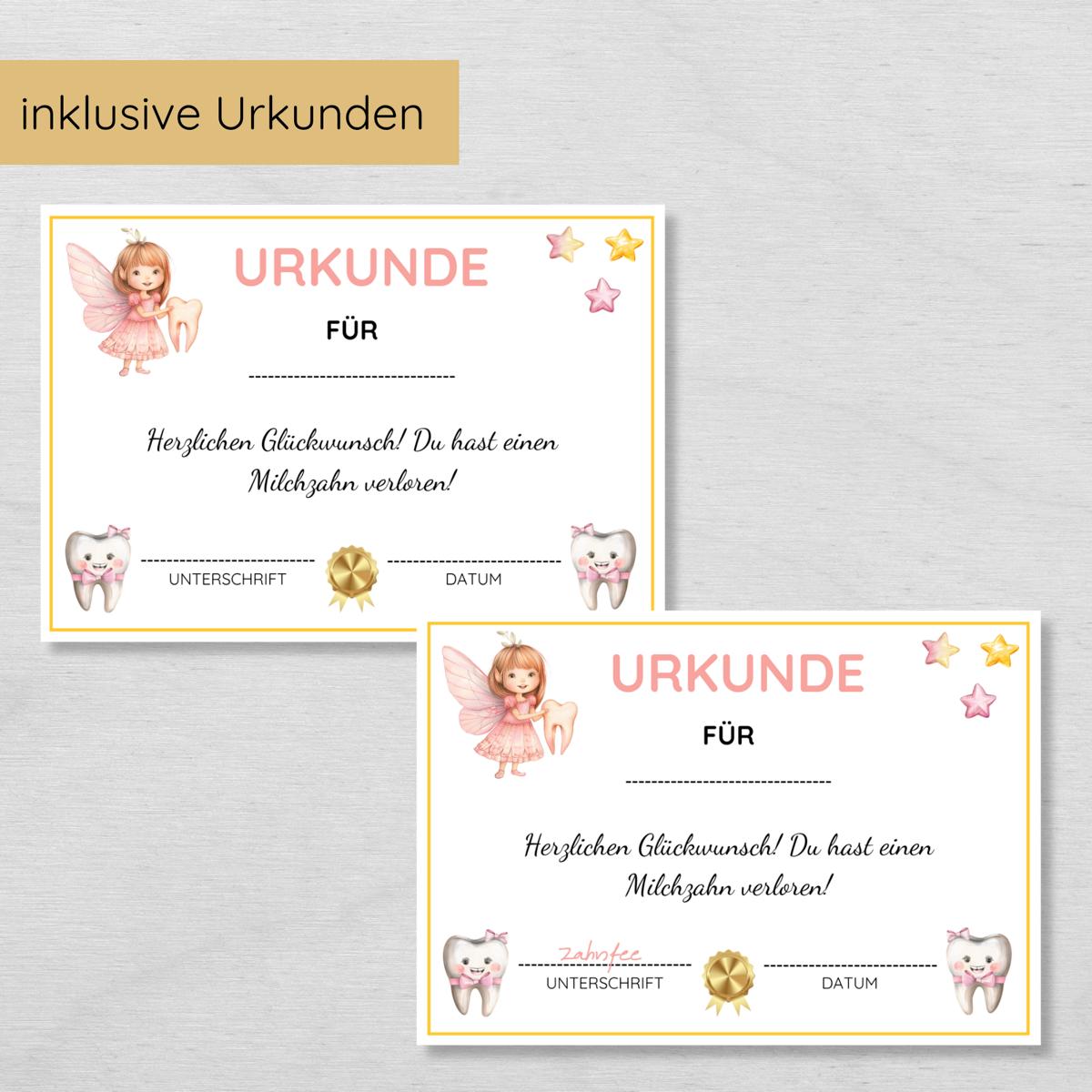 - 1 schöne Urkunde: In zwei Varianten – einmal mit der Unterschrift der Zahnfee und einmal ohne.