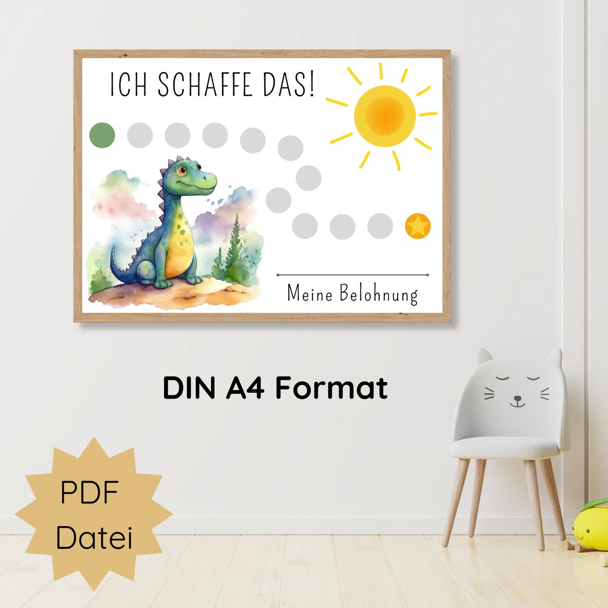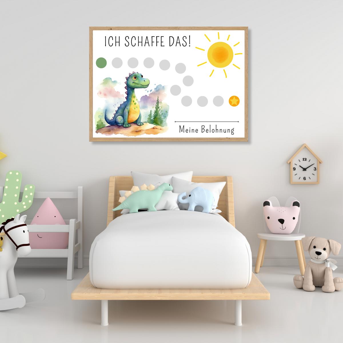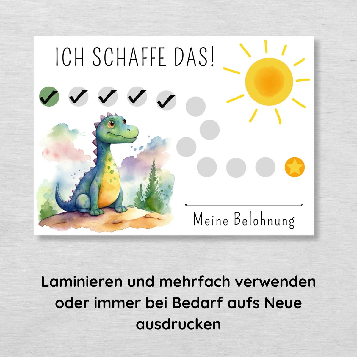 Unsere Belohnungstafel mit Dinosaurier Motiv ist genau das Richtige, um dein Kind zu motivieren und ihm zu helfen, seine Aufgaben mit Spaß und Eifer zu bewältigen. Jeder abgehakte Kreis auf der Tafel symbolisiert einen kleinen Schritt auf dem Weg zu großen Erfolgen. So behält dein Kind stets den Überblick über seine Fortschritte und wird durch die Aussicht auf eine Belohnung zusätzlich angespornt.