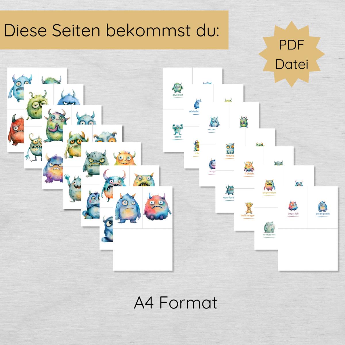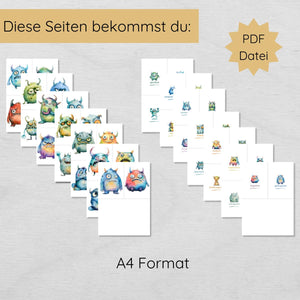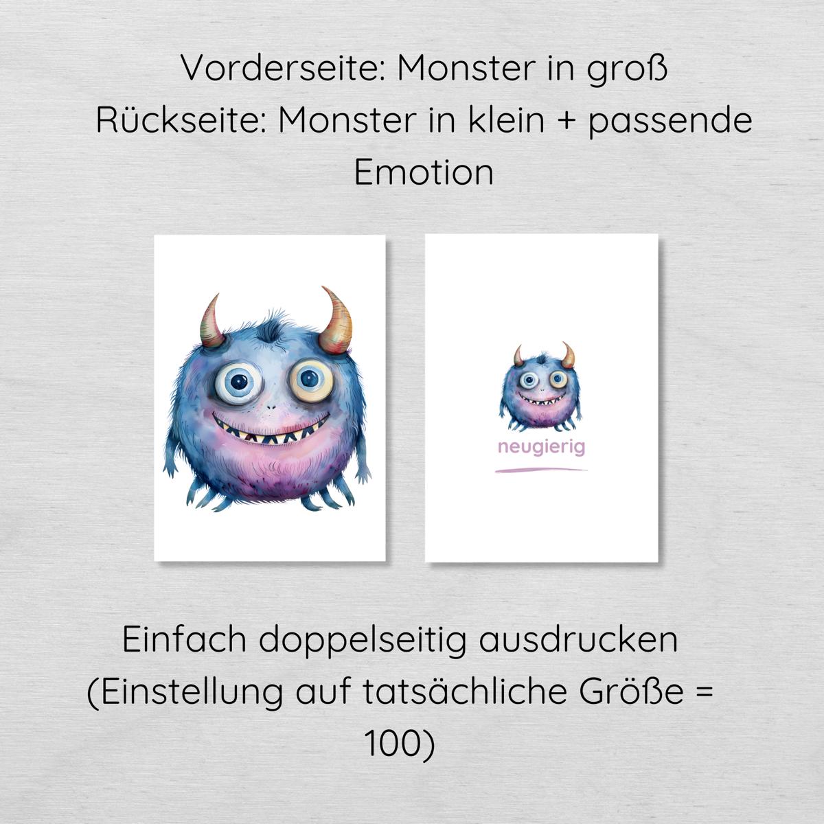 Nach deinem Kauf bekommst du eine PDF-Datei mit insgesamt 14 DIN A4 Seiten (je 4 Karten pro Seite), die doppelseitig auf voller Größe ausgedruckt werden soll. So befindet sich auf der Vorderseite das Monster in groß und auf der Rückseite das Monsterchen nochmal in klein und mit der passenden Emotion.