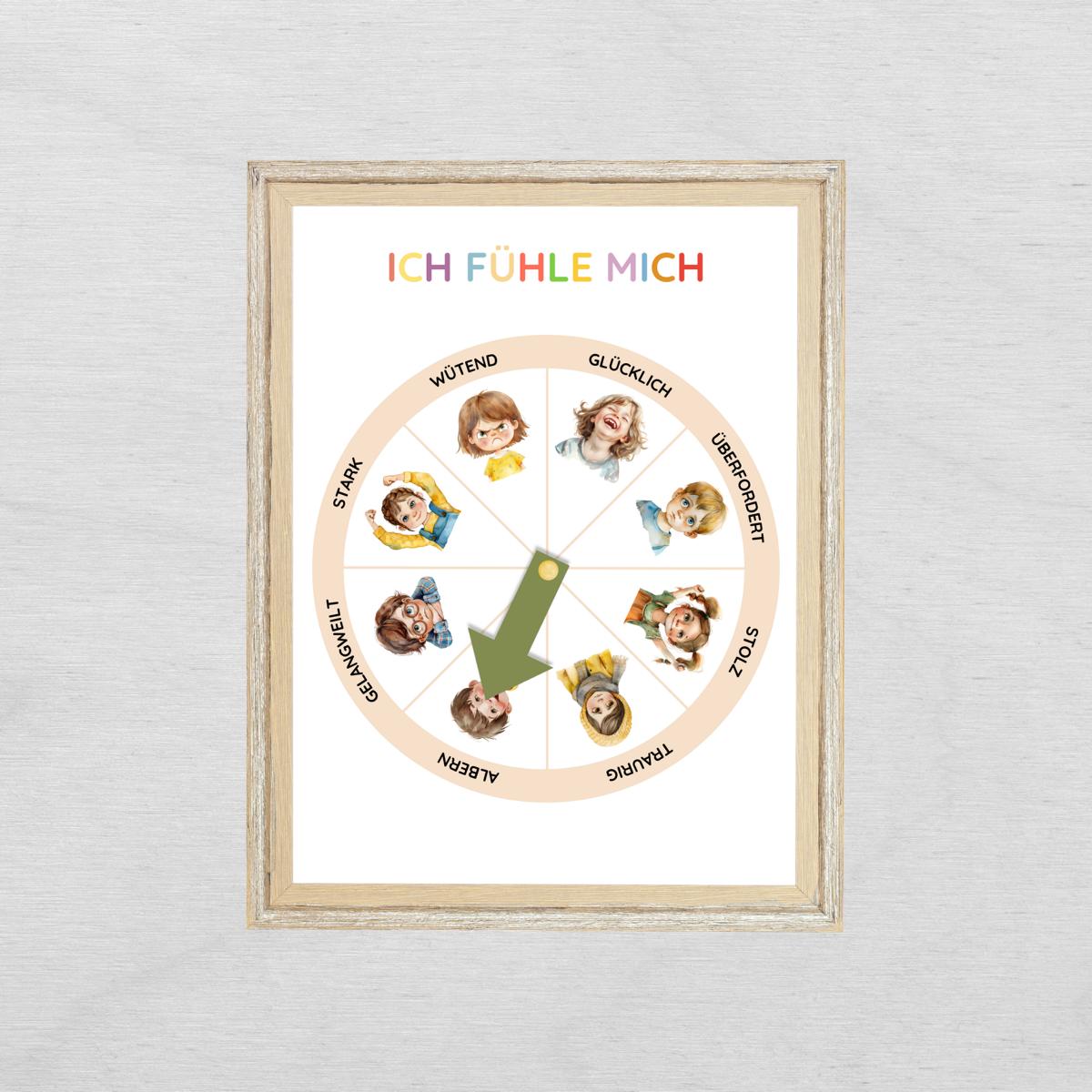 Das Gefühlsrad mit menschlichen Gesichtern ist ein kreatives Hilfsmittel, um Kindern den Umgang mit Emotionen zu erleichtern. Mit ausdrucksstarken Gesichtern wird die emotionale Entwicklung spielerisch gefördert. Ideal für den Alltag in der Familie, Kita oder Schule.