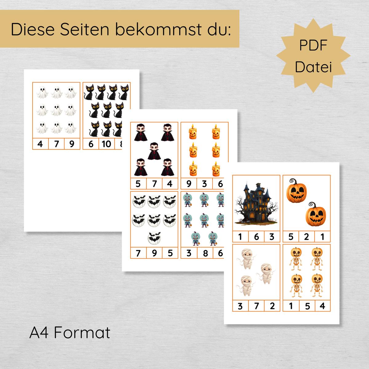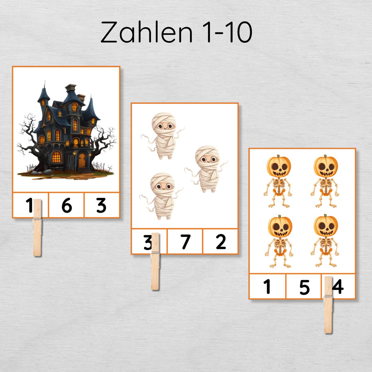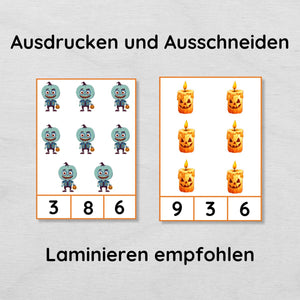 Mach das Zahlen lernen für dein Kind zu einem kleinen Abenteuer! Mit unseren Halloween Klammerkarten wird das Üben der Zahlen bis 10 zu einer spielerischen und spannenden Aktivität. Bunte Motive von Geistern, Kürbissen und Vampiren sorgen für leuchtende Kinderaugen und halten die Motivation hoch – Lernen wird so zum echten Vergnügen.