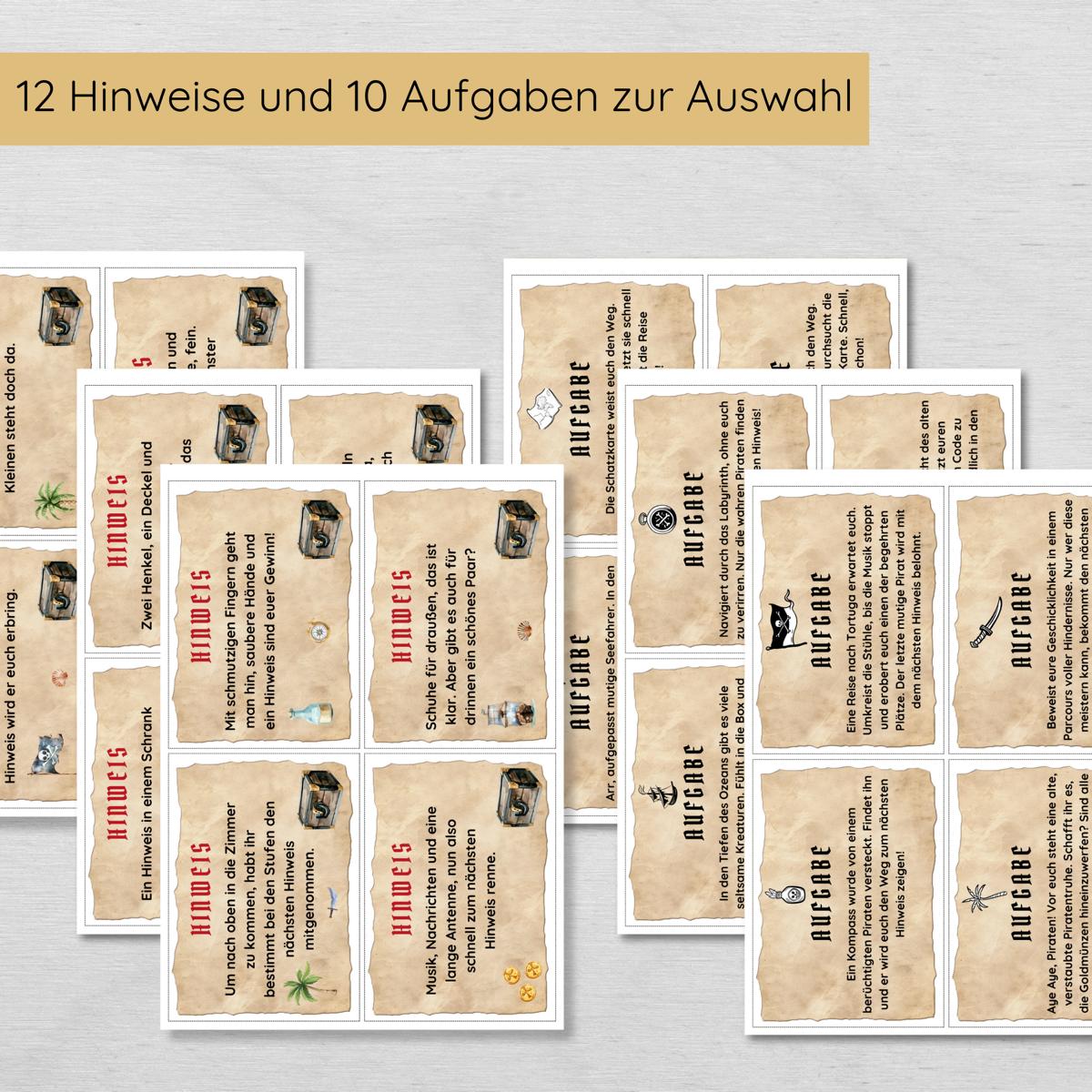Die Schatzsuche ist auf 7 Stationen ausgelegt, aber du erhältst zusätzliche Hinweise und Aufgaben, um die Schnitzeljagd individuell an eure Bedürfnisse anzupassen. Nur der Start und die Abschlussaufgabe sind festgelegt.