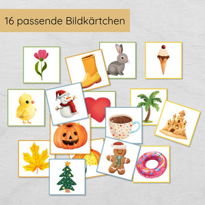 - Jahreszeiten spielerisch entdecken: Dein Kind lernt, typische Motive den richtigen Jahreszeiten zuzuordnen.