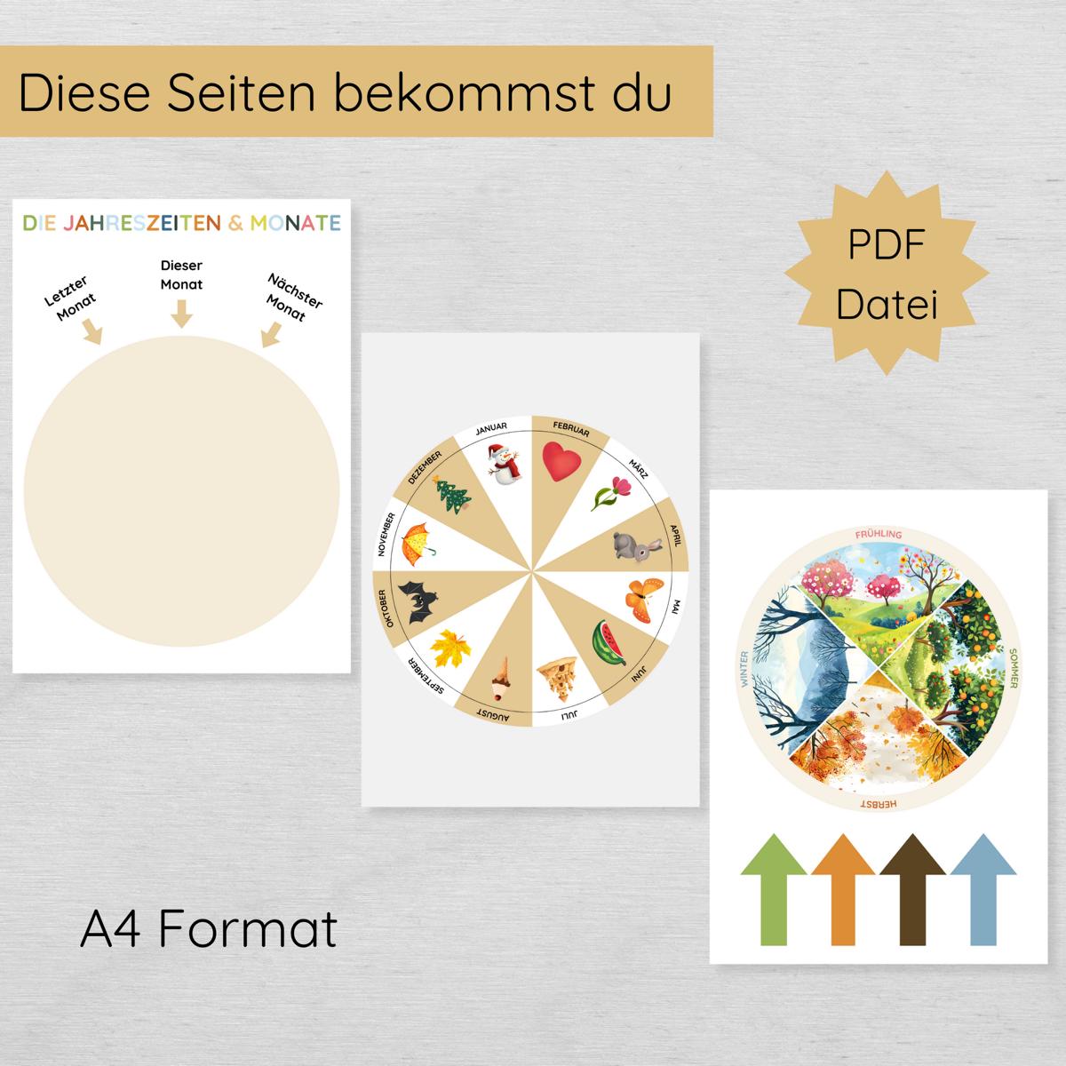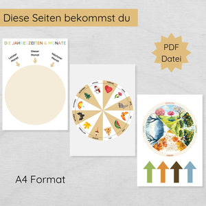 Das Jahreszeiten- und Monatsrad wird als praktisches Bastelset geliefert, das du direkt nach dem Kauf zu Hause ausdrucken und nutzen kannst. Nach dem Laminieren werden das Jahreszeitenrad, das Monatsrad und ein farbiger Pfeil ausgeschnitten und mit einer Musterbeutelklammer verbunden.