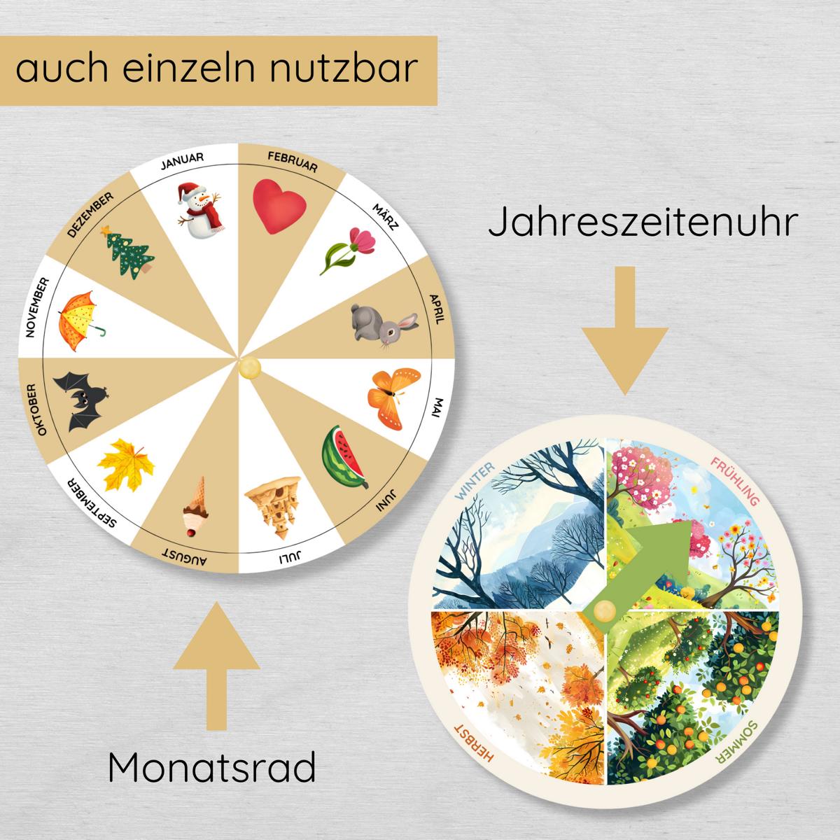 Das Lernset bietet zwei Anwendungsmöglichkeiten: entweder als kombinierte Jahreszeiten- und Monatsscheibe oder getrennt als eigenständiges Monatsrad und Jahreszeitenuhr.