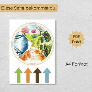 Dieses Bastelset enthält die Scheibe selbst und 4 Pfeile, die frei nach Belieben verwendet werden können. Einfach die Teile ausdrucken, ausschneiden und mit einer Musterbeutelklammer verbinden. Für zusätzliche Langlebigkeit empfehlen wir, die Teile vor dem Ausschneiden zu laminieren, damit das Jahreszeitenrad auch nach vielen Anwendungen stabil bleibt.