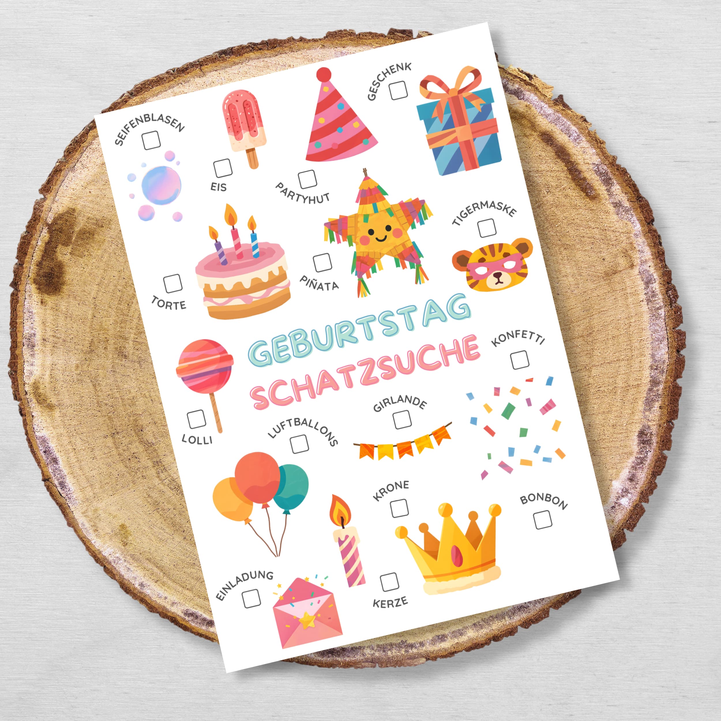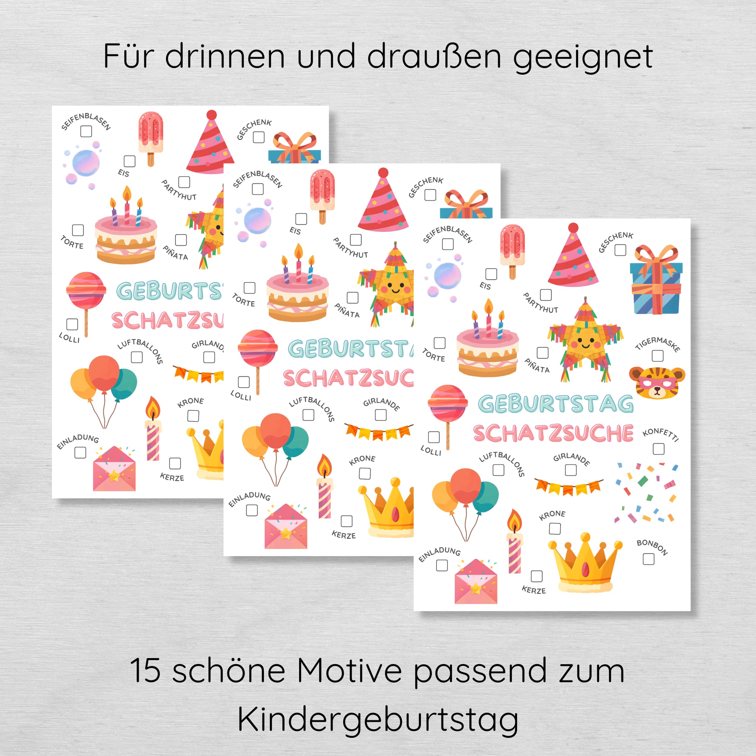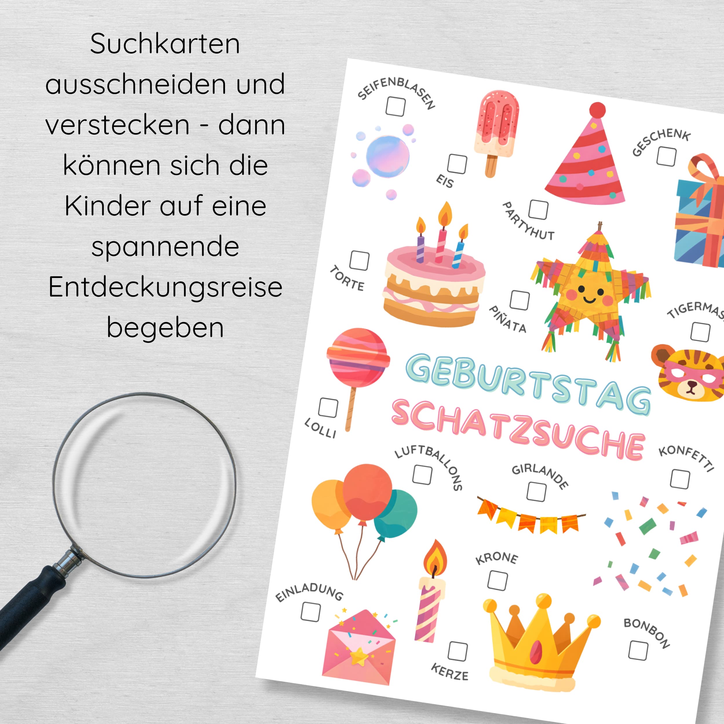 Die Schatzsuche funktioniert flexibel im Haus, in der Wohnung oder im Garten. Passende Bildkarten werden versteckt und von den Kindern gesucht und abgehakt – einfach, klar strukturiert und ohne komplizierte Vorbereitung.