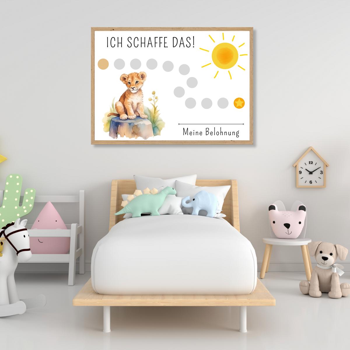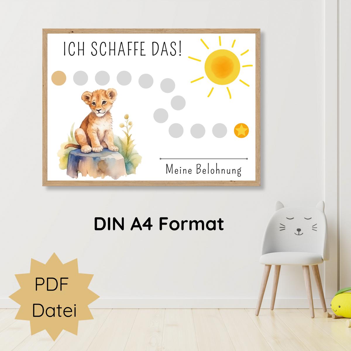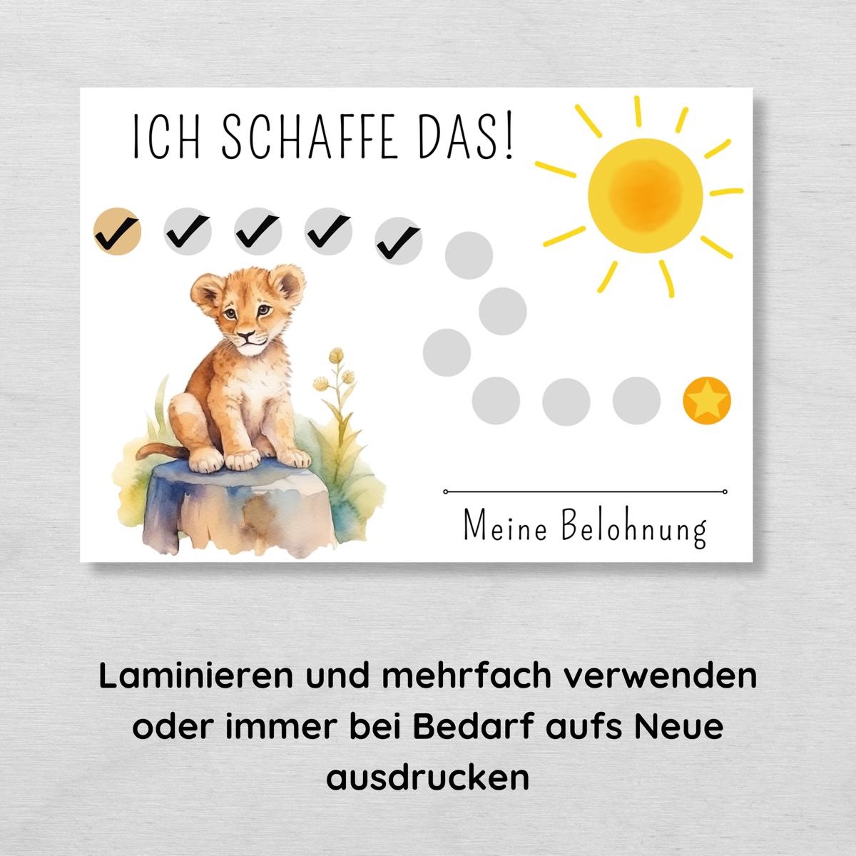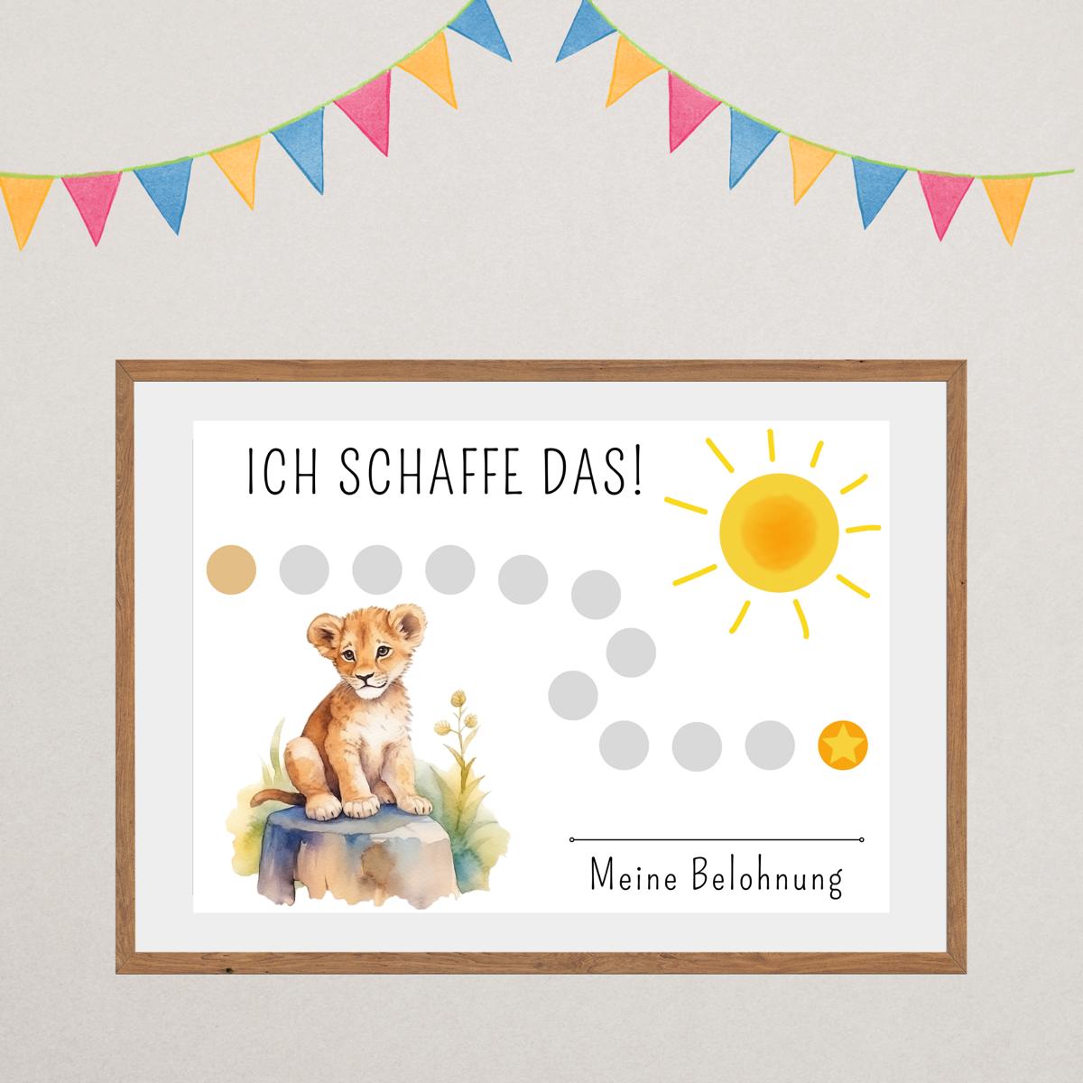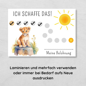 Unser liebevoll gestalteter Belohnungsplan mit Löwenmotiv unterstützt Kinder dabei, ihre Aufgaben mit Begeisterung zu bewältigen und ihre Ziele spielerisch zu erreichen. Die einfache Struktur mit abhakbaren Kreisen ermöglicht es Kindern, ihren Fortschritt leicht nachzuvollziehen und motiviert sie kontinuierlich.