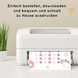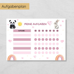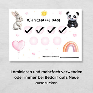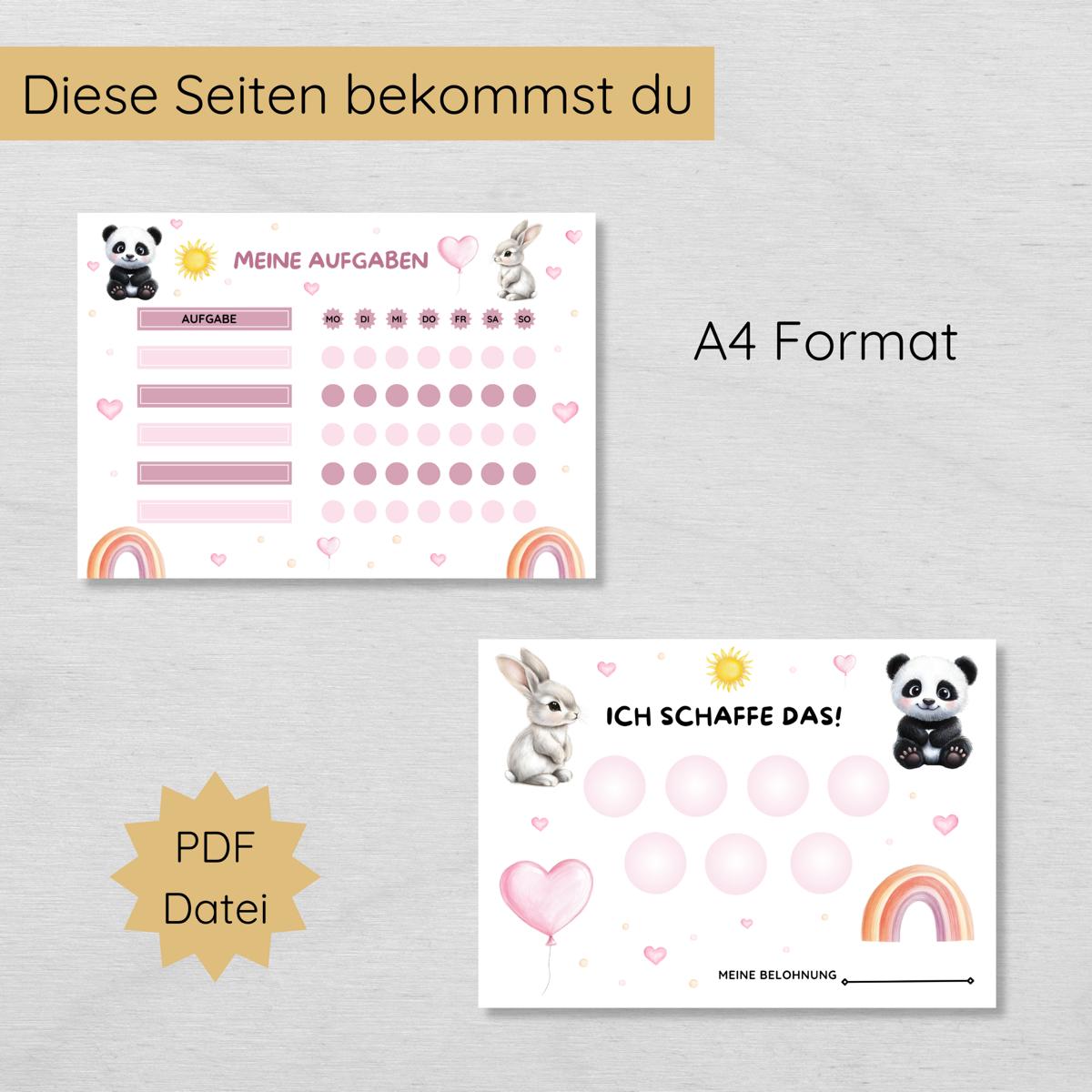 Mit liebevollen Illustrationen von Hase, Panda und Regenbogen wird jeder Tag zu einem kleinen Abenteuer. Ob Zähneputzen, Aufräumen oder Hausaufgaben, der Plan motiviert dein Kind, Verantwortung zu übernehmen und selbstständig zu handeln. Für jede erfüllte Aufgabe darf ein Kästchen gefüllt werden, bis es eine wohlverdiente Wunschbelohnung gibt!
