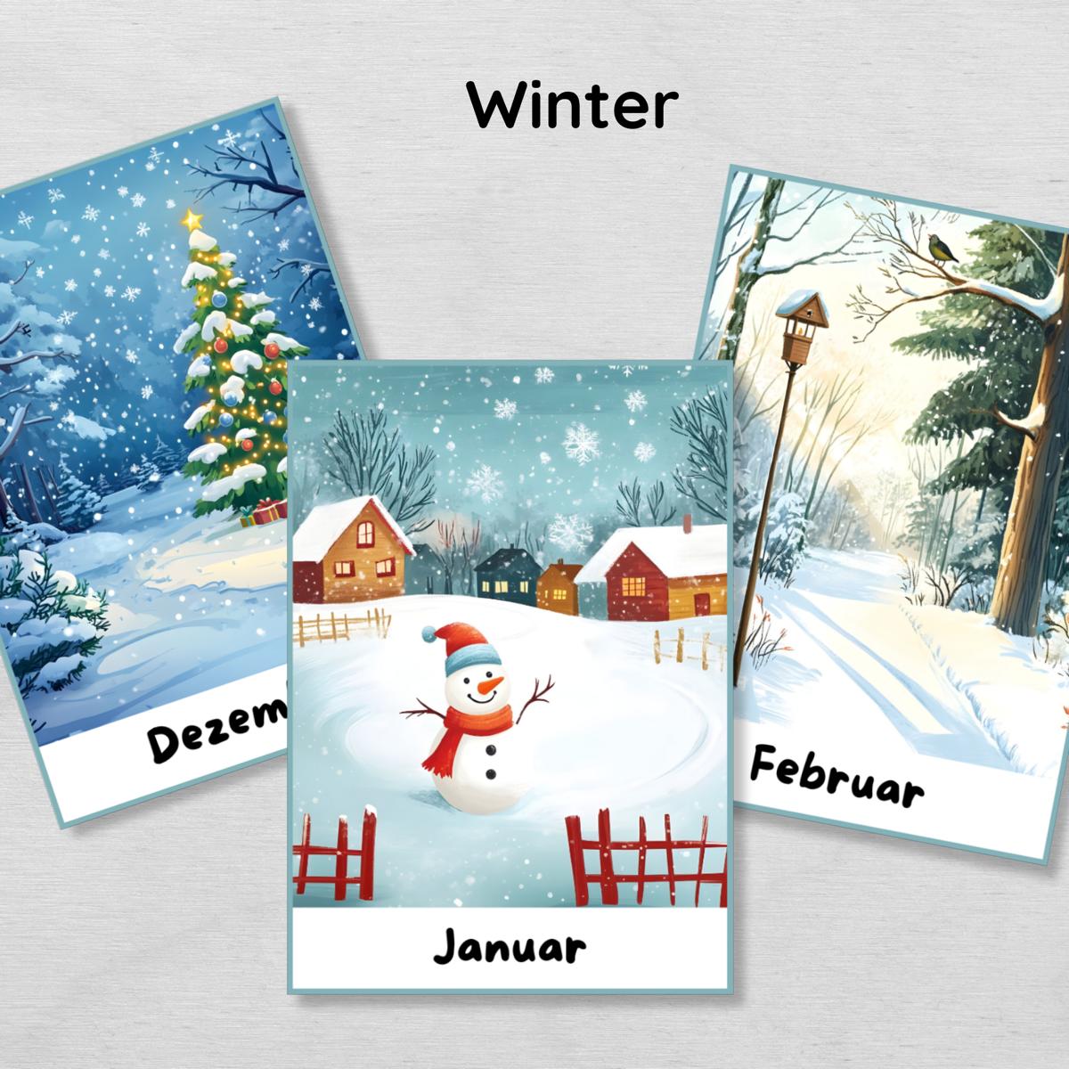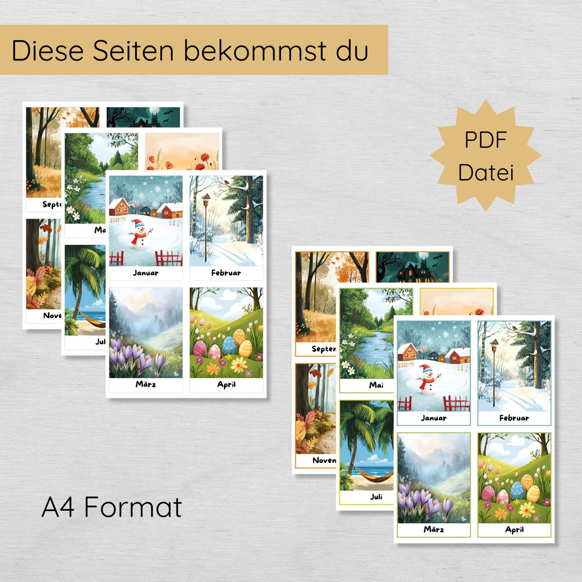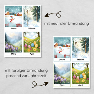 Mit diesen anschaulichen Lernkarten kannst du deinem Kind spielerisch die 12 Monate des Jahres näherbringen und die Jahreszeiten veranschaulichen.