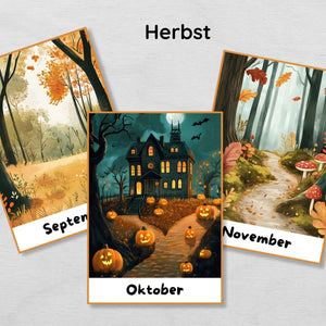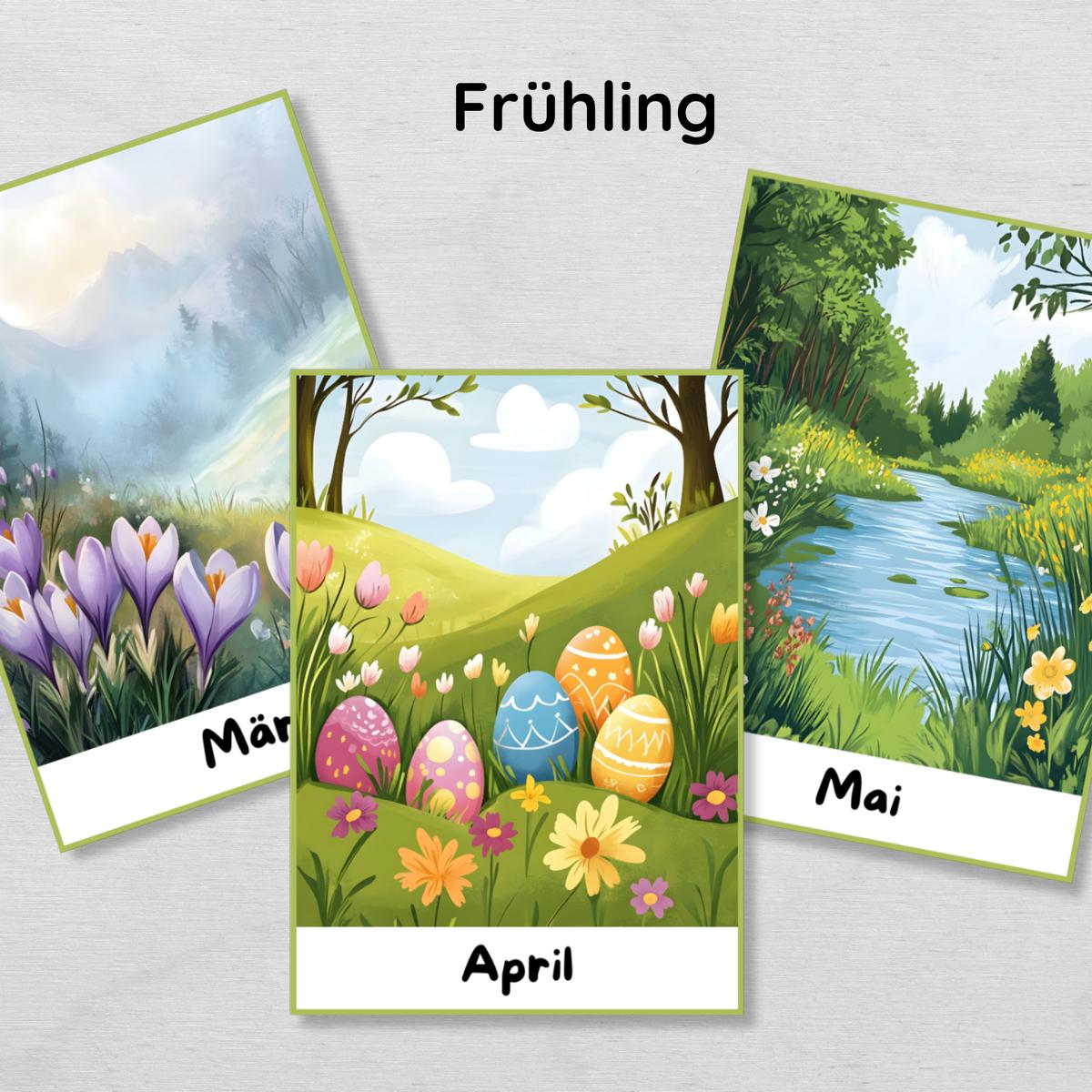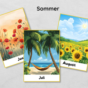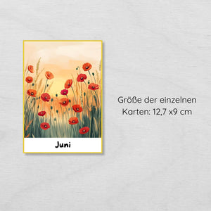 Jede Karte zeigt einen Monat mit passender Illustration, sodass Kinder den Jahresverlauf und typische Ereignisse leicht verstehen.