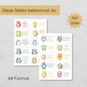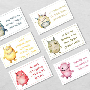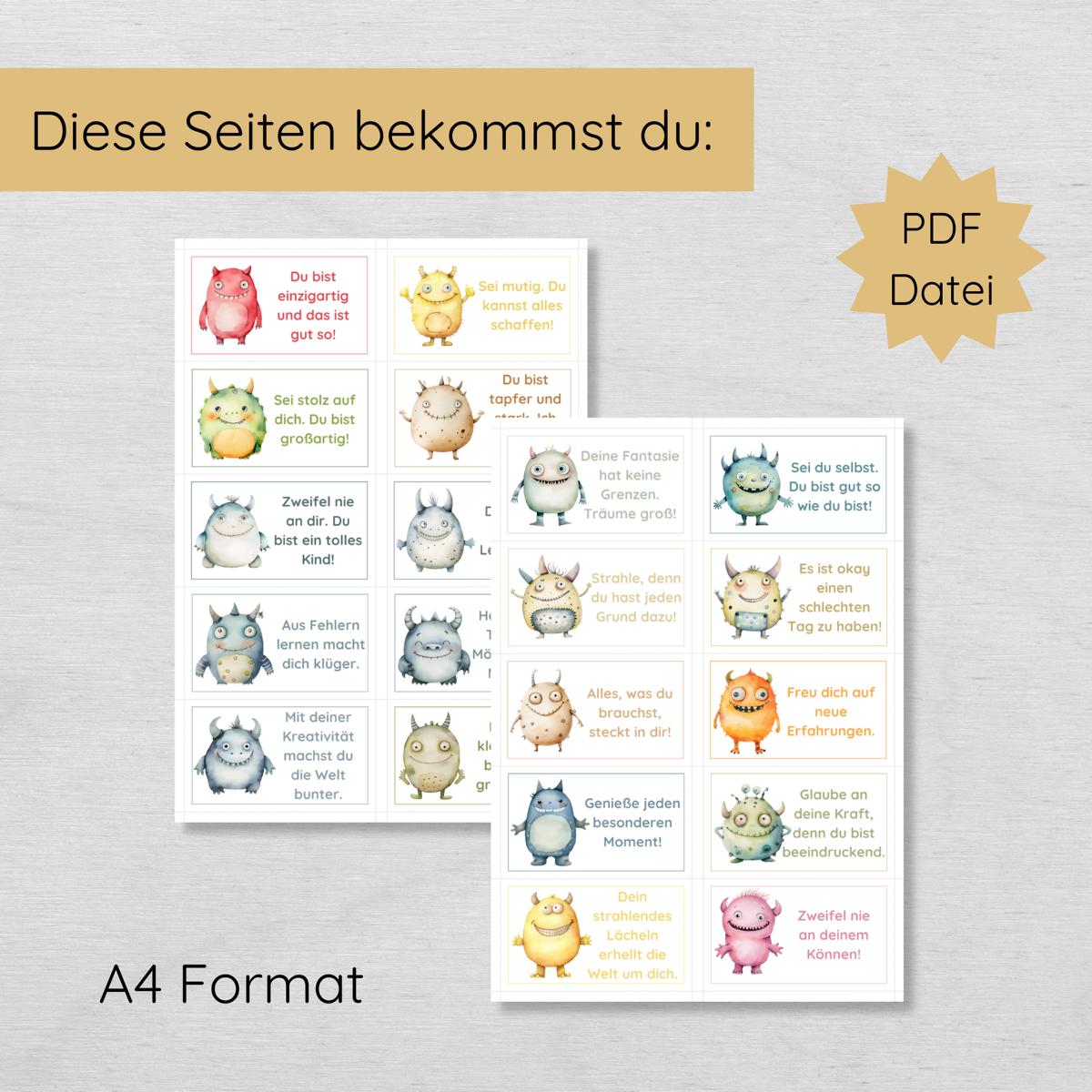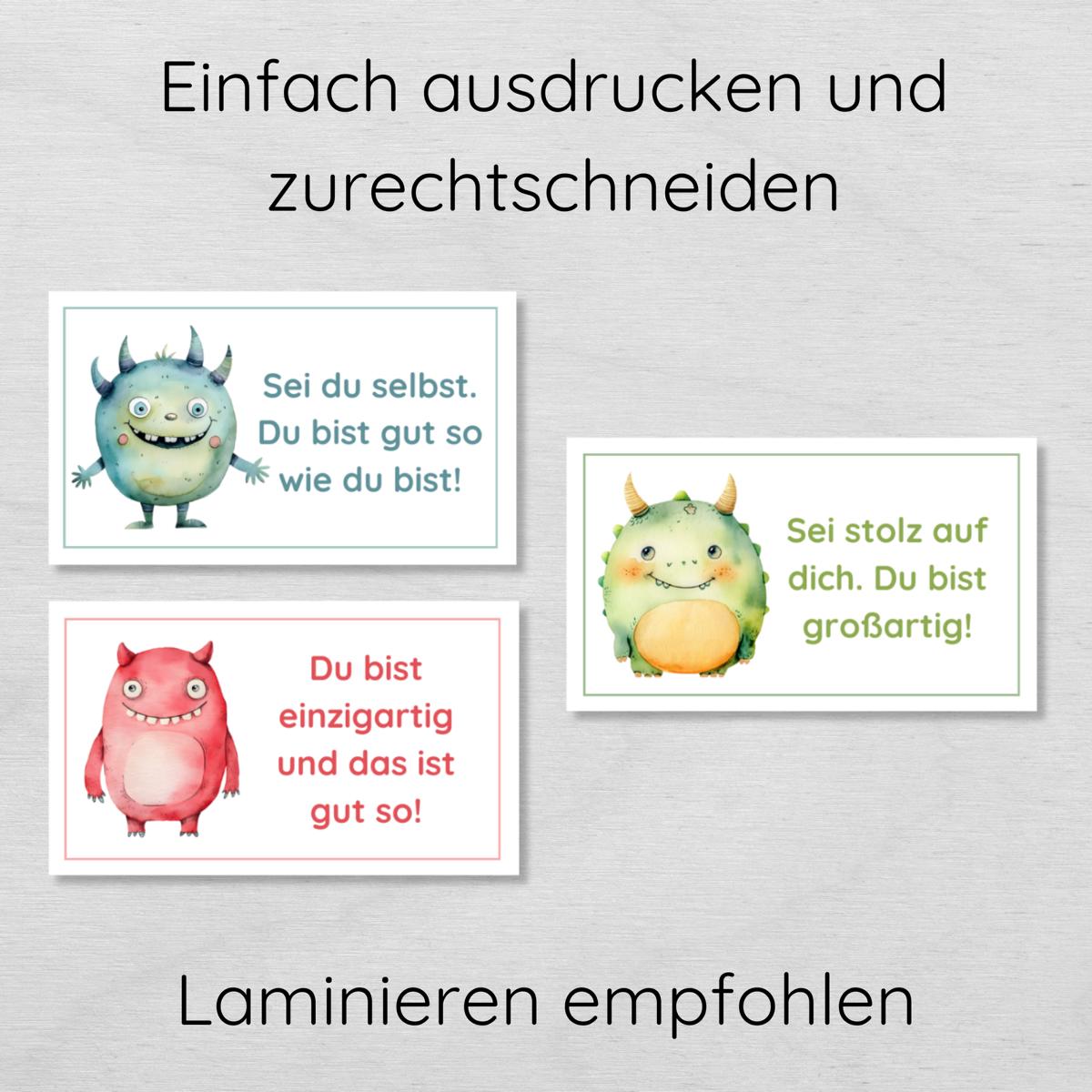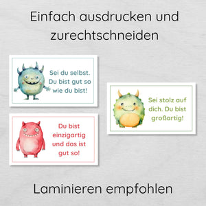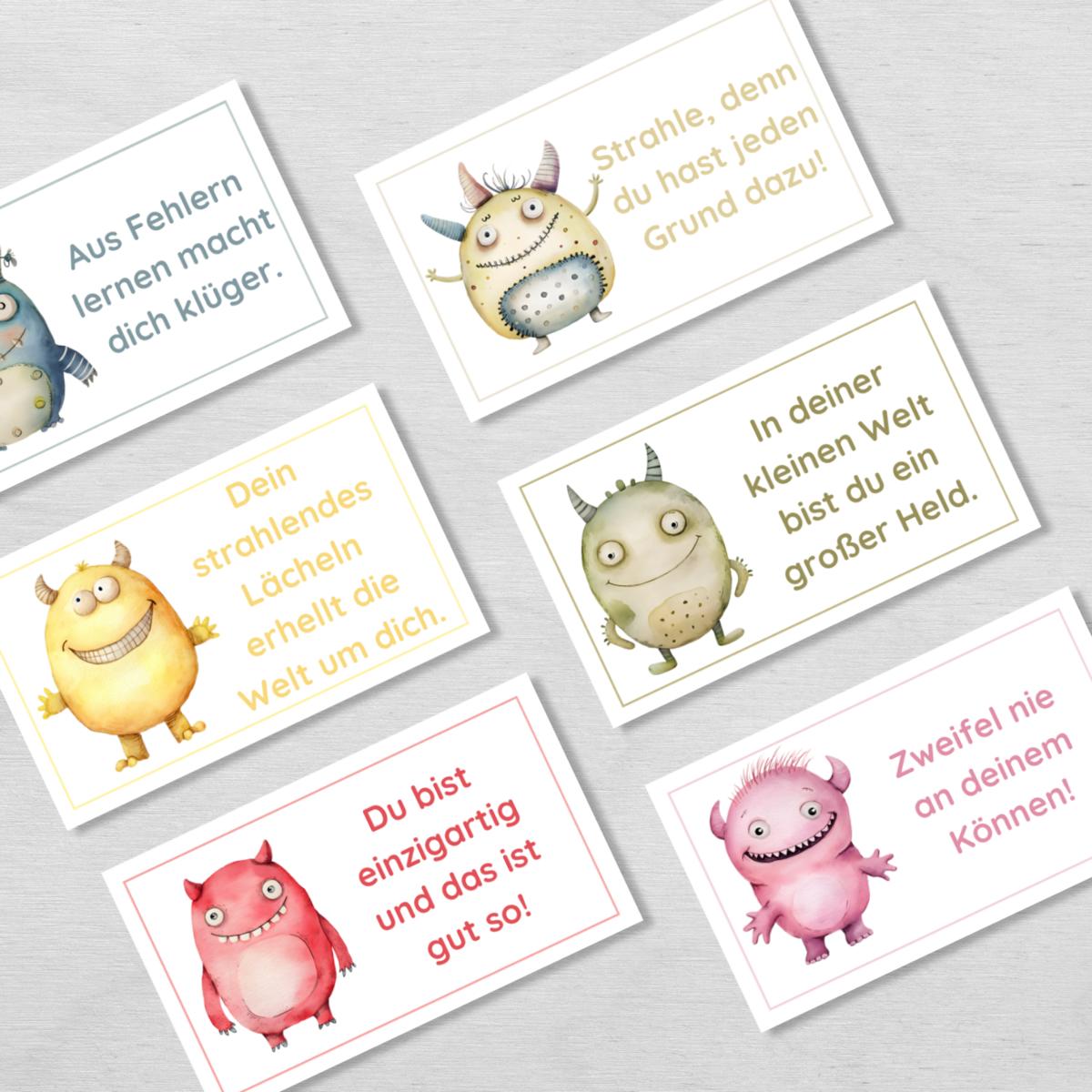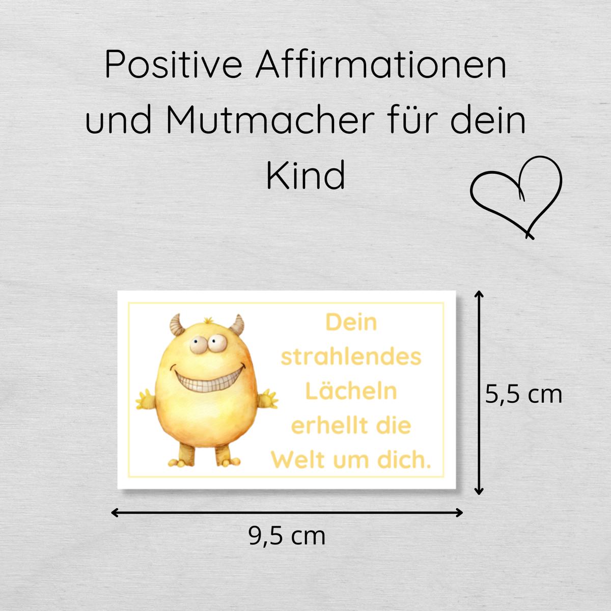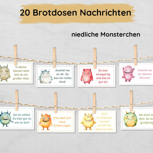 Auf den 20 Brotdosen Nachrichten findest du niedliche, bunte Monster, die eine positive Affirmation oder einen aufmunternden Spruch präsentieren. Diese Botschaften sind darauf ausgelegt, das Selbstbewusstsein und Selbstvertrauen deines Kindes zu stärken und ihm den Schultag zu verschönern.