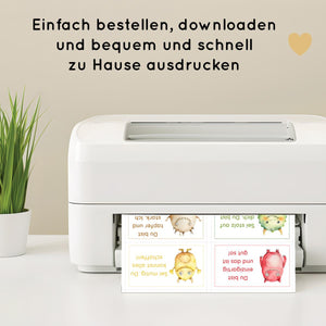Nach deinem Kauf erhältst du eine PDF-Datei mit insgesamt 2 DIN A4 Seiten, die du bequem zu Hause ausdrucken und zurechtschneiden kannst.