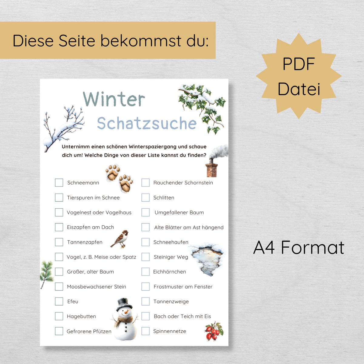 Tauche ein in eine magische Winterwelt! Unsere Winter Schatzsuche für Kinder macht jeden Spaziergang zu einem spannenden Abenteuer. Mit dieser praktischen PDF-Vorlage erkunden Kinder spielerisch die Natur – ob glitzernde Eiszapfen oder spannende Tierspuren im Schnee.