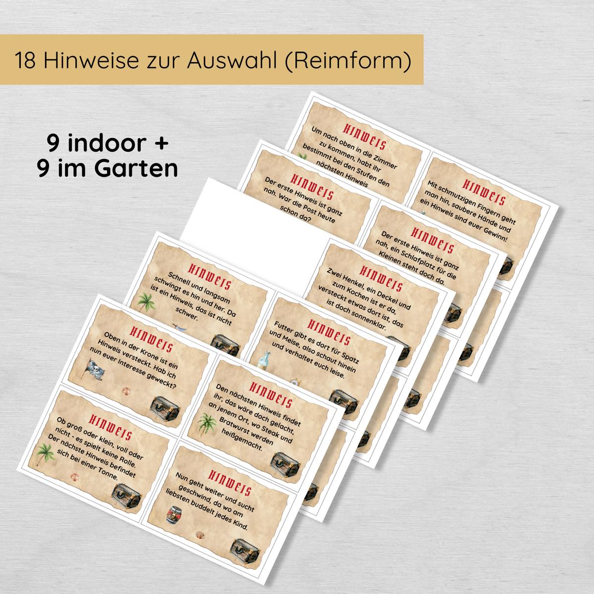 - 18 Versteckmöglichkeiten in Rätselform (9 indoor und 9 im Garten)