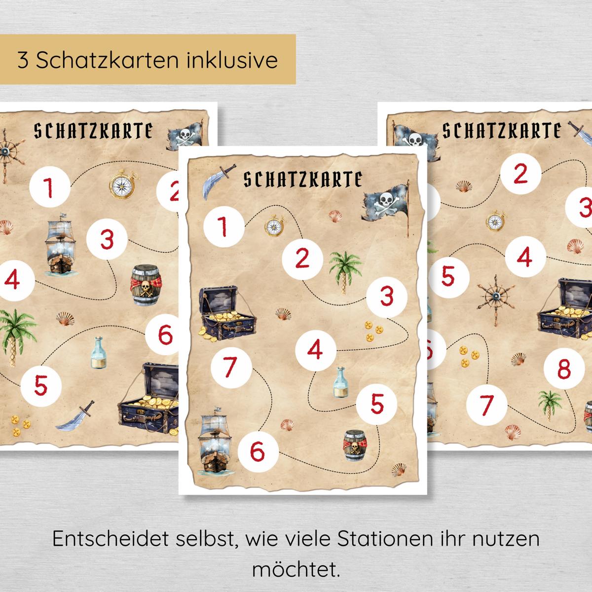 - 3 Schatzkarten mit 6, 7 und 8 Stationen