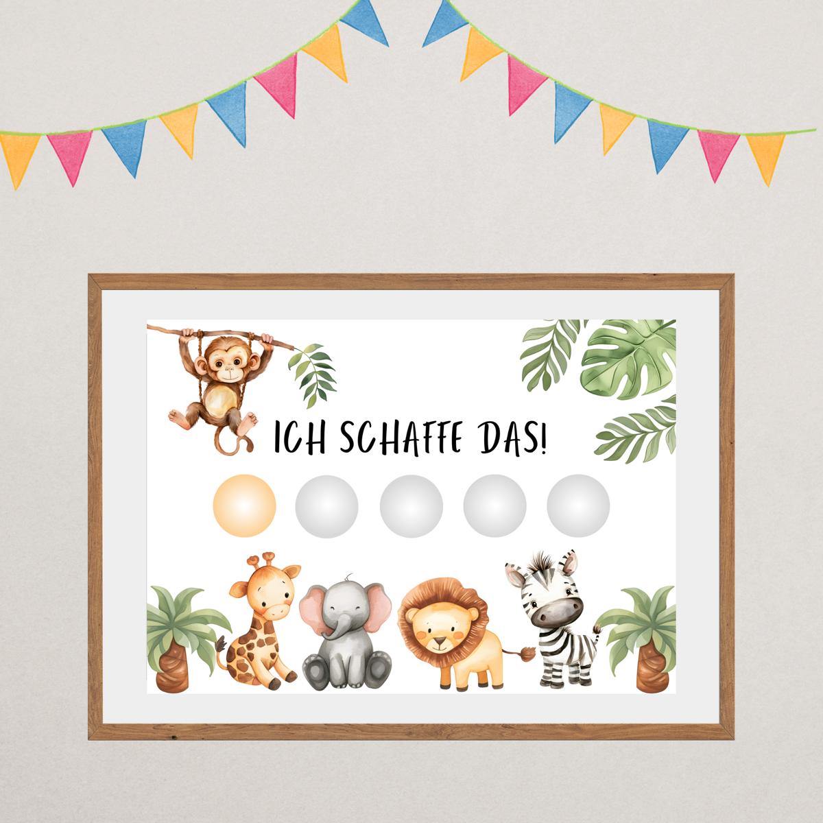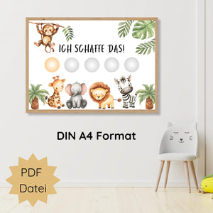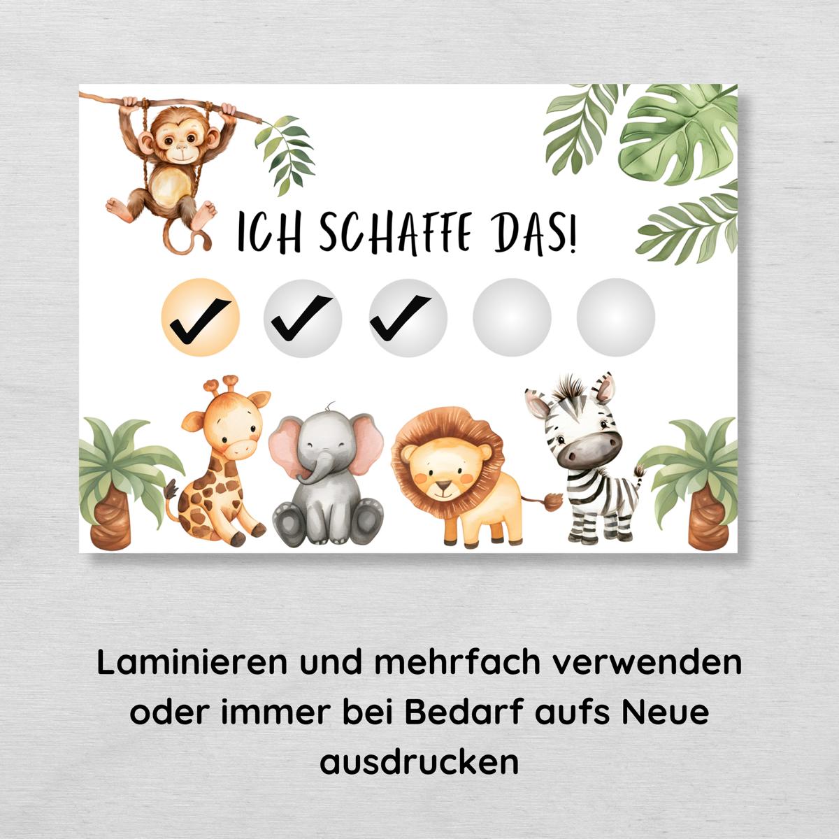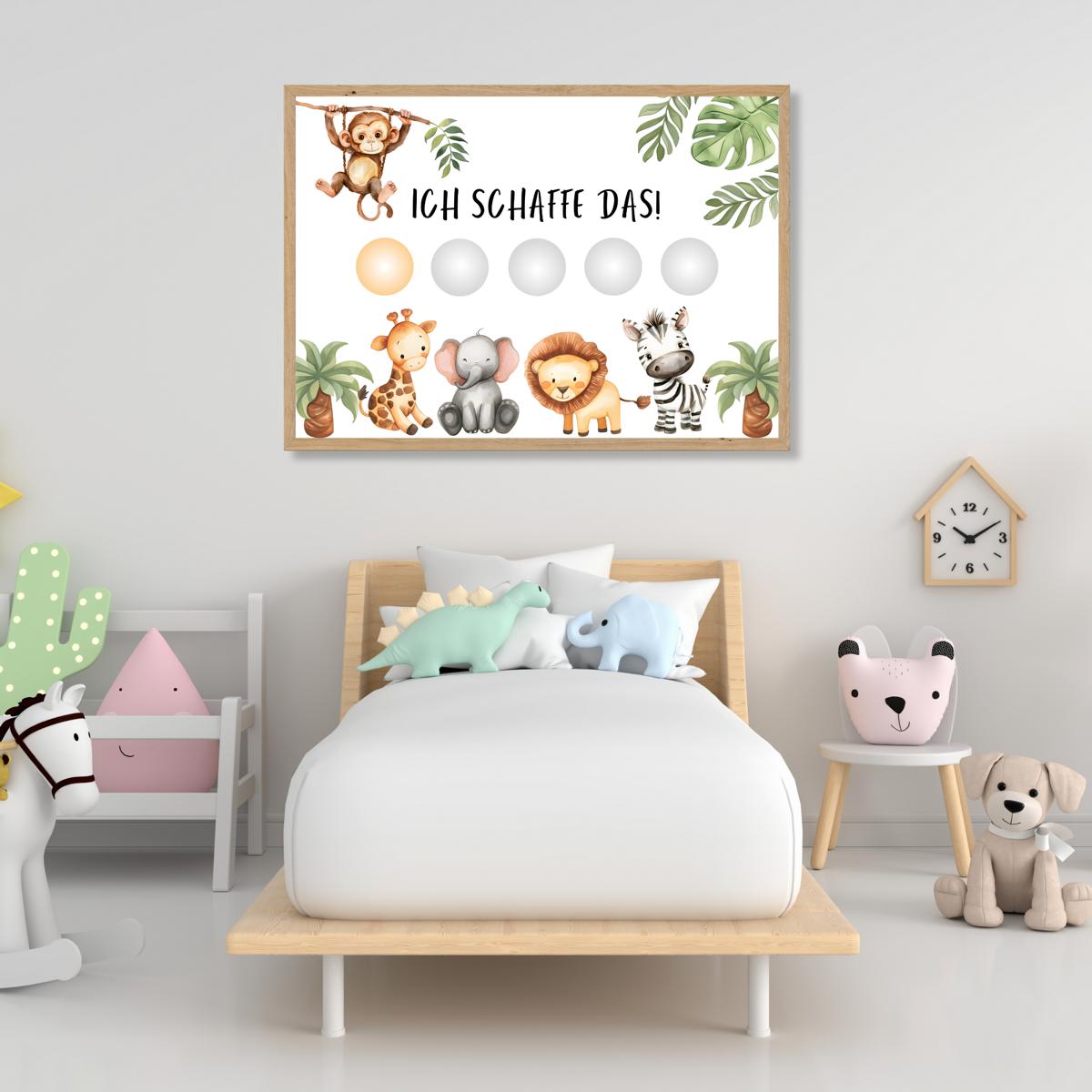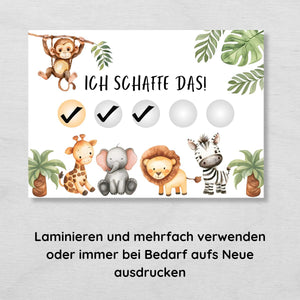 - Tierische Abenteuer: Die süßen Safari-Tiere wie Elefanten, Zebras und Giraffen animieren dein Kind, tägliche Aufgaben voller Freude zu erledigen. Die bunten Motive sorgen für Spaß und Abwechslung im Alltag.