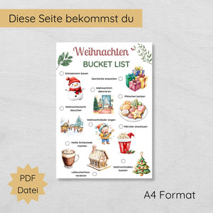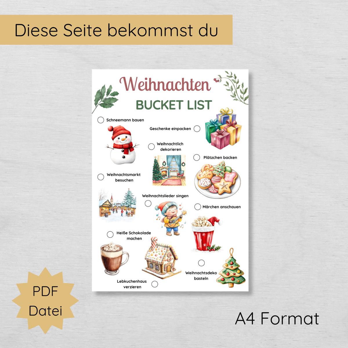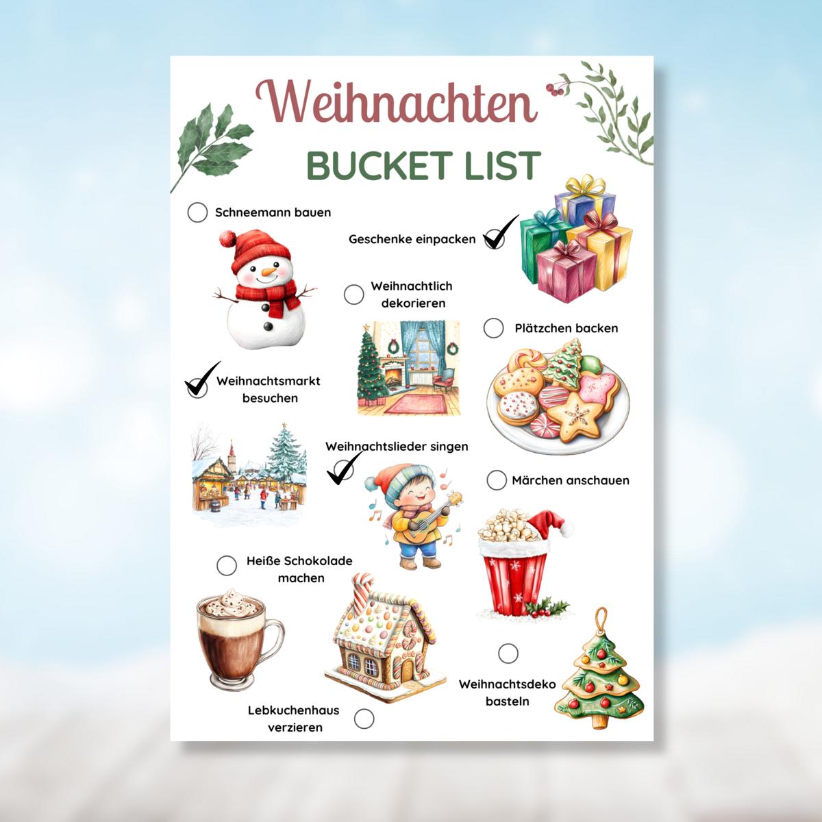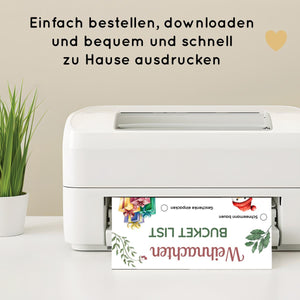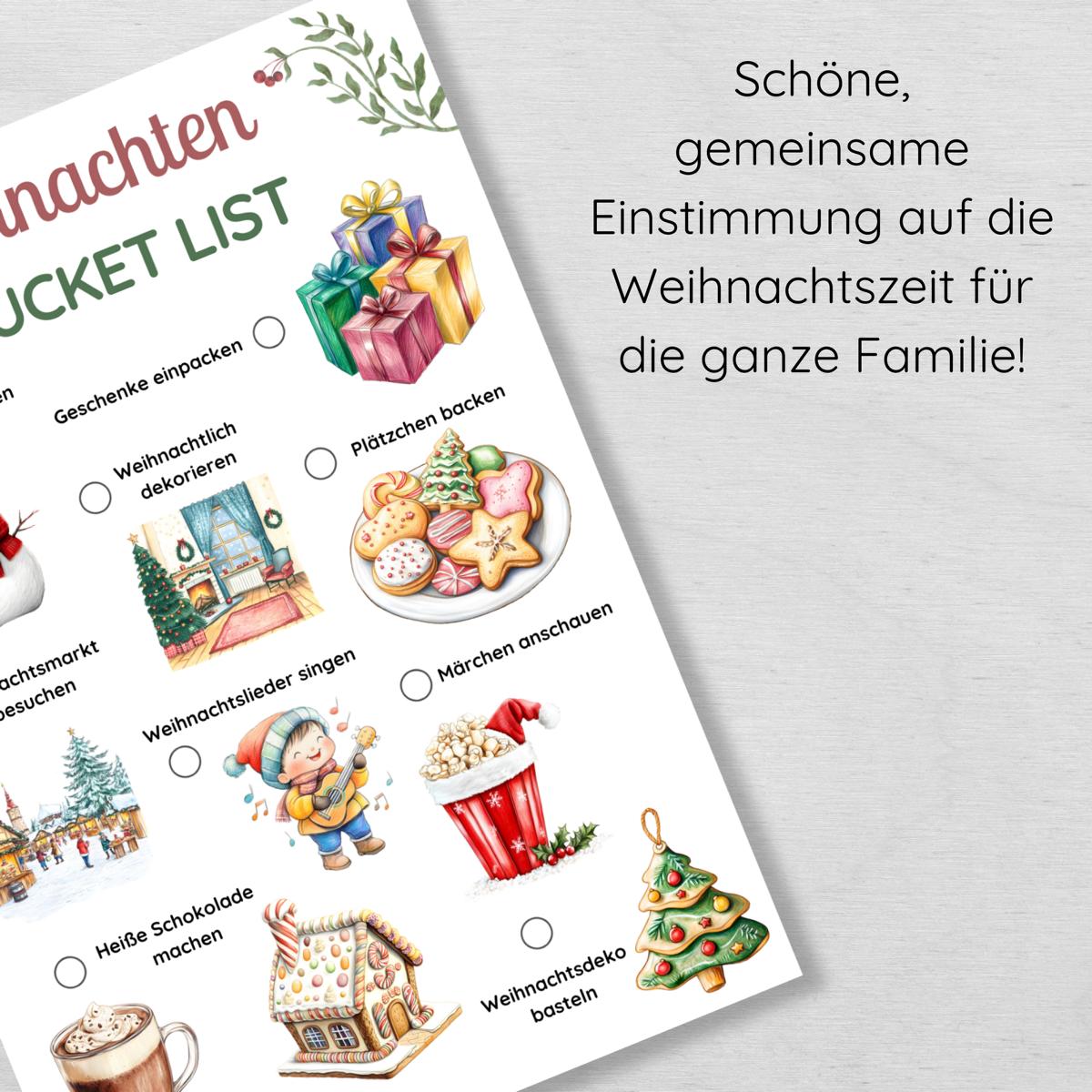 Diese bunte Weihnachten Bucket List ist das perfekte Tool, um die Adventszeit mit der Familie noch festlicher zu gestalten! Die vorausgefüllte Liste bietet inspirierende Weihnachtsaktivitäten, die Groß und Klein zum Mitmachen animieren. Die fröhlichen Farben und zauberhaften Illustrationen bringen Weihnachtsstimmung ins Haus und machen die Vorfreude noch größer.