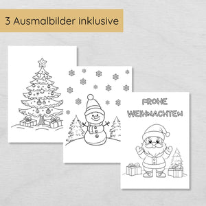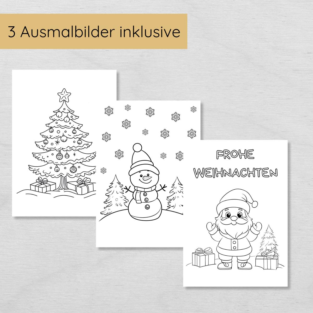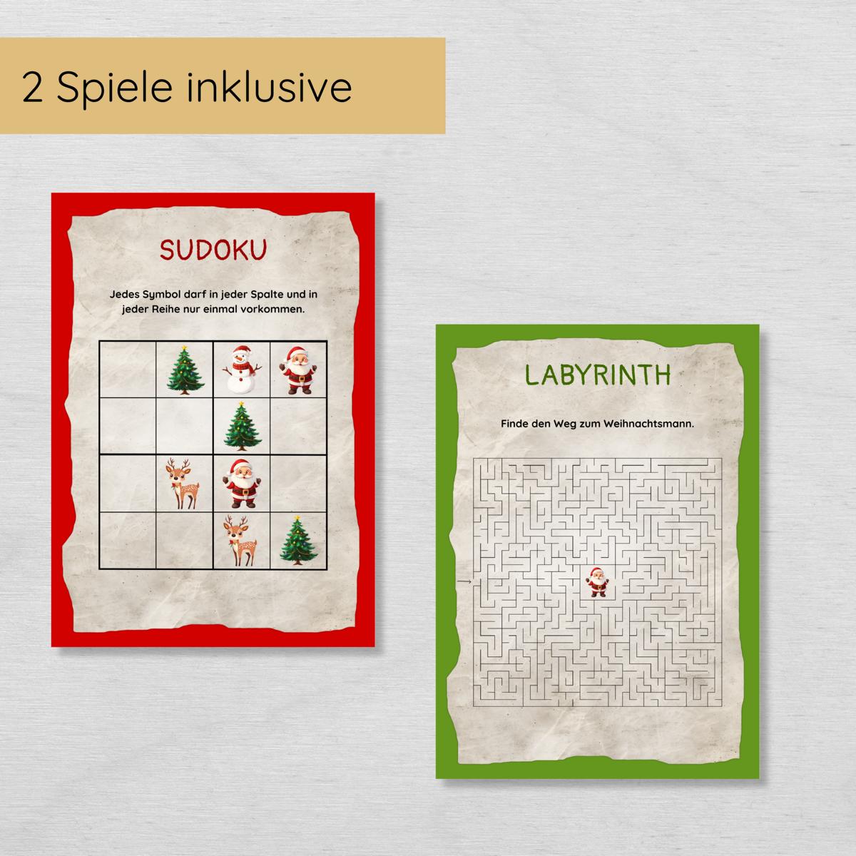 - Weihnachtliche Zusatzspiele: Mit zwei Spielen und drei weihnachtlichen Ausmalbildern ist für extra viel Weihnachtsstimmung gesorgt.