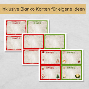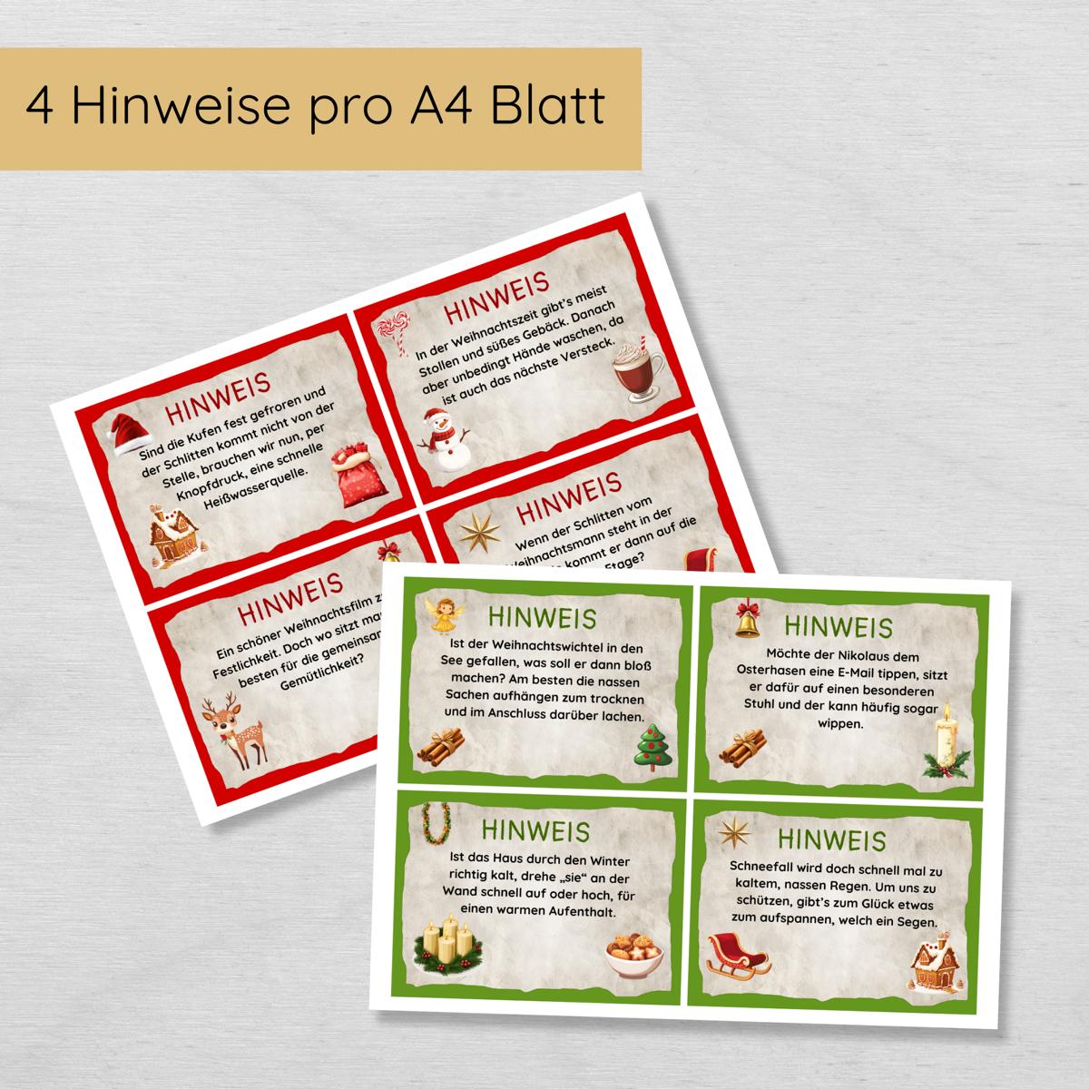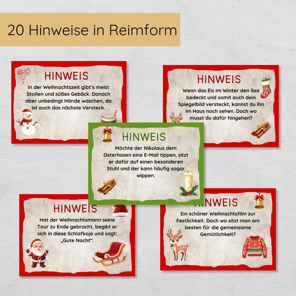 - Magische Weihnachtshinweise: Die 20 gereimten Hinweiskarten führen die Kinder spielerisch durch die Wohnung und wecken die Vorfreude auf das Weihnachtsfest.
