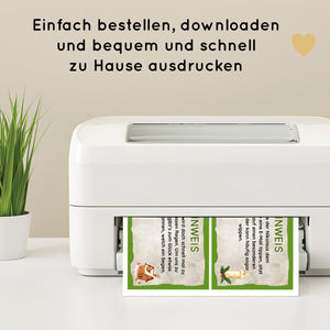 Nach deinem Kauf erhältst du eine PDF-Datei mit insgesamt 17 DIN A4 Seiten, die du bequem zu Hause herunterladen und ausdrucken kannst. Anschließend kannst du die Hinweiskarten direkt zurechtschneiden und an den vorgegebenen Orten verstecken.