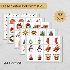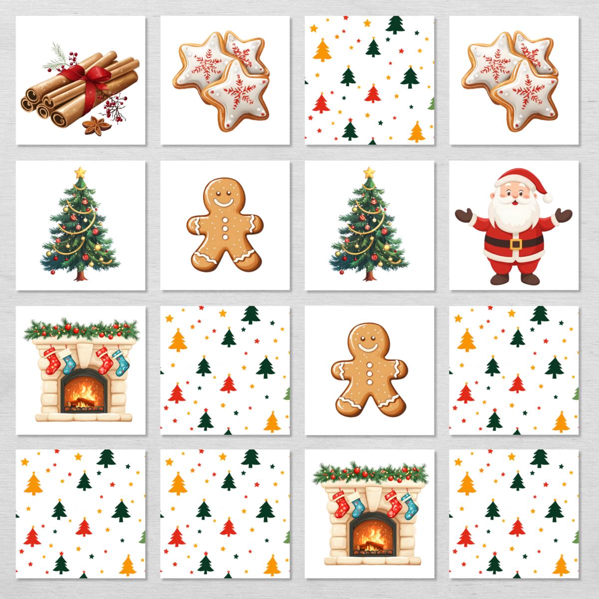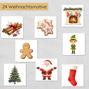 - Wunderschöne Weihnachtsmotive: 24 Kartenpaare mit klassischen Symbolen wie Weihnachtsbaum, Stern, Geschenke und Wunschzettel – ideal, um die Vorfreude auf die Festtage zu steigern.