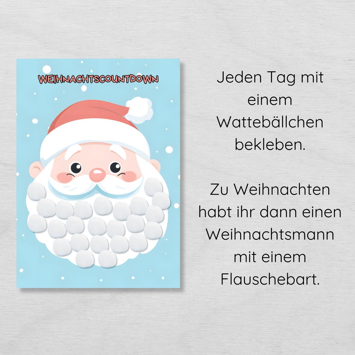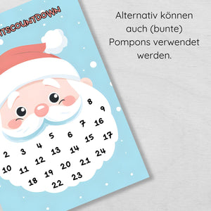 Weihnachtscountdown Adventskalender für Kinder – Weihnachtsmann Bart zum Bekleben mit Wattebällchen oder Pompons
