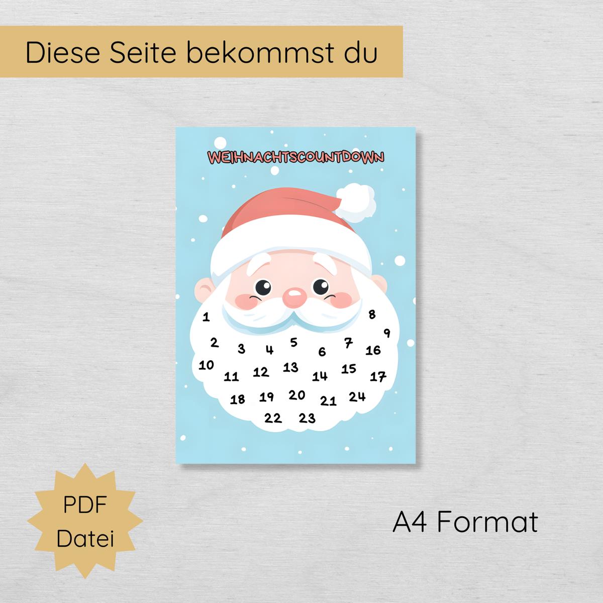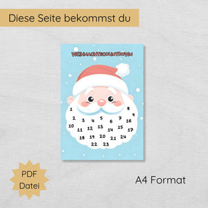 - Inhalt: PDF-Druckvorlage mit einem Weihnachtsmann und den Zahlen 1 bis 24