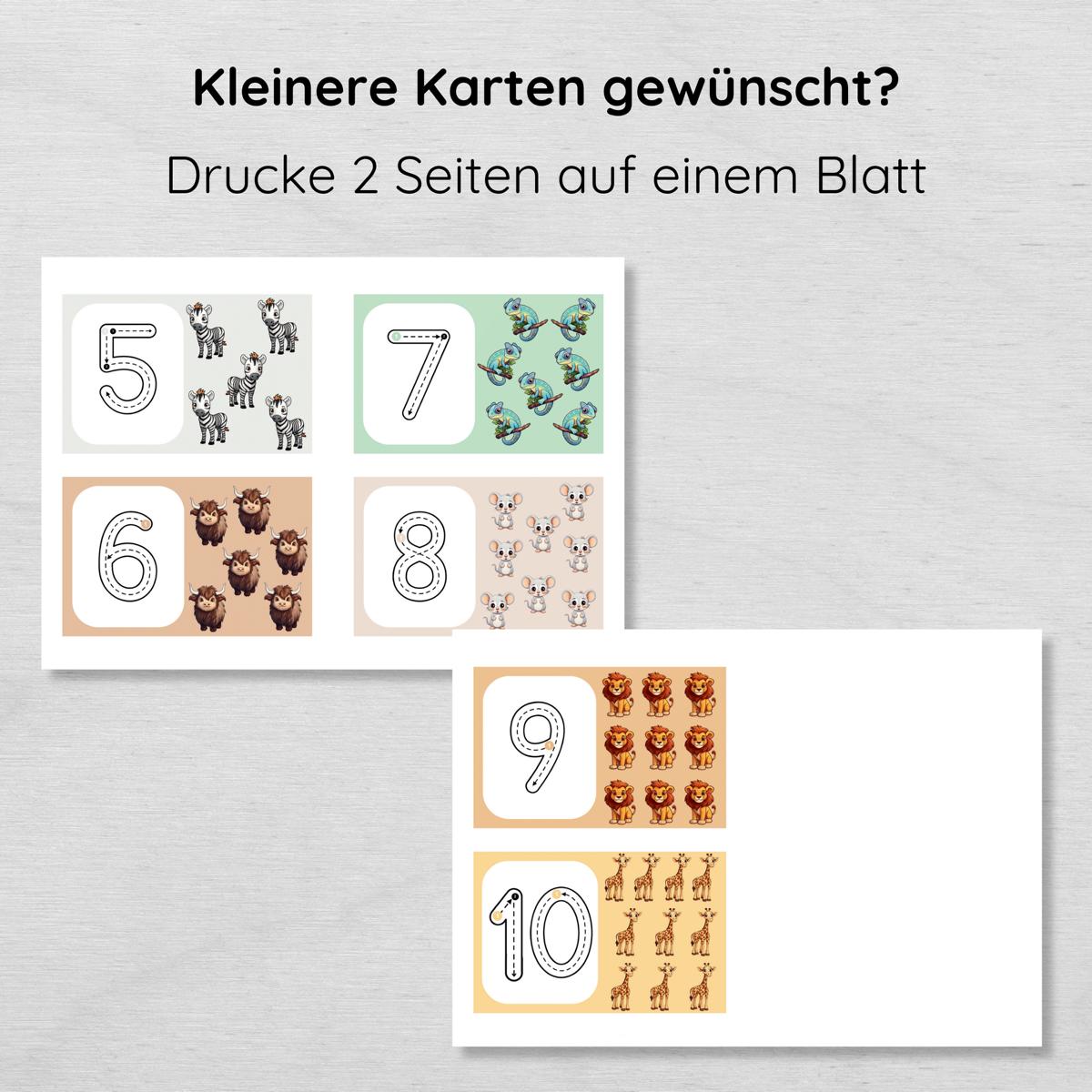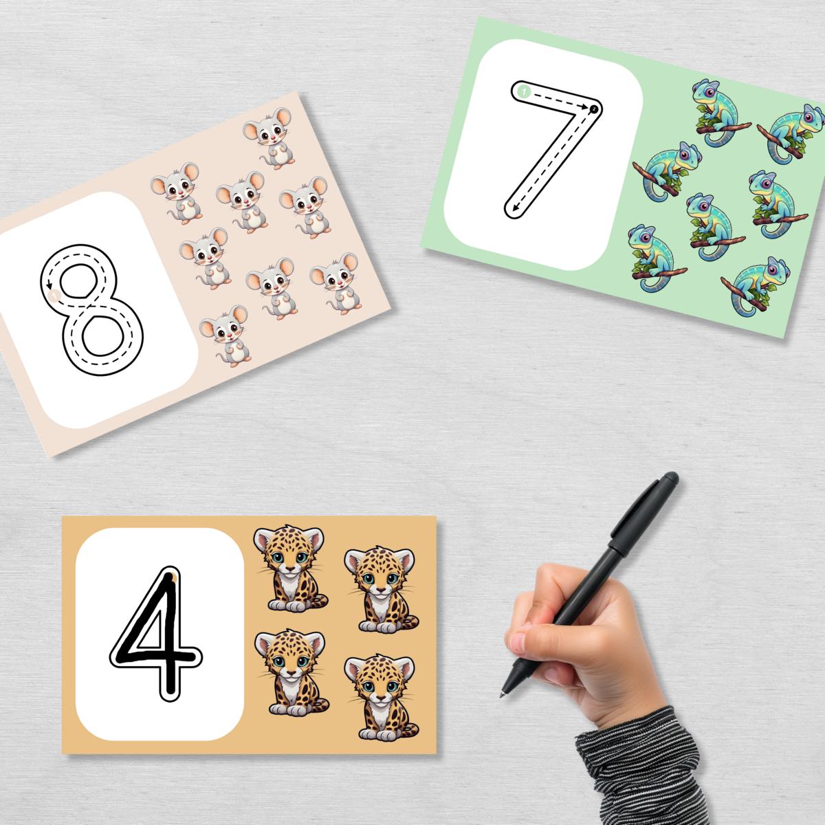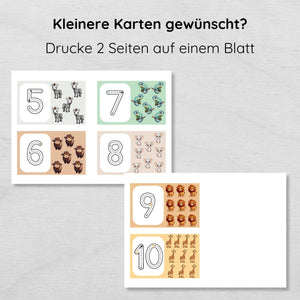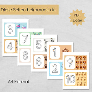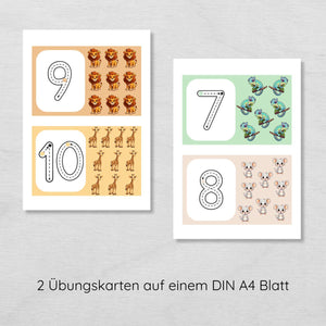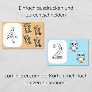 Auf den 10 Karten findest du jeweils eine Zahl, die die Kinder nachspuren sollen und die dazu passende Anzahl an niedlichen Tier Illustrationen.