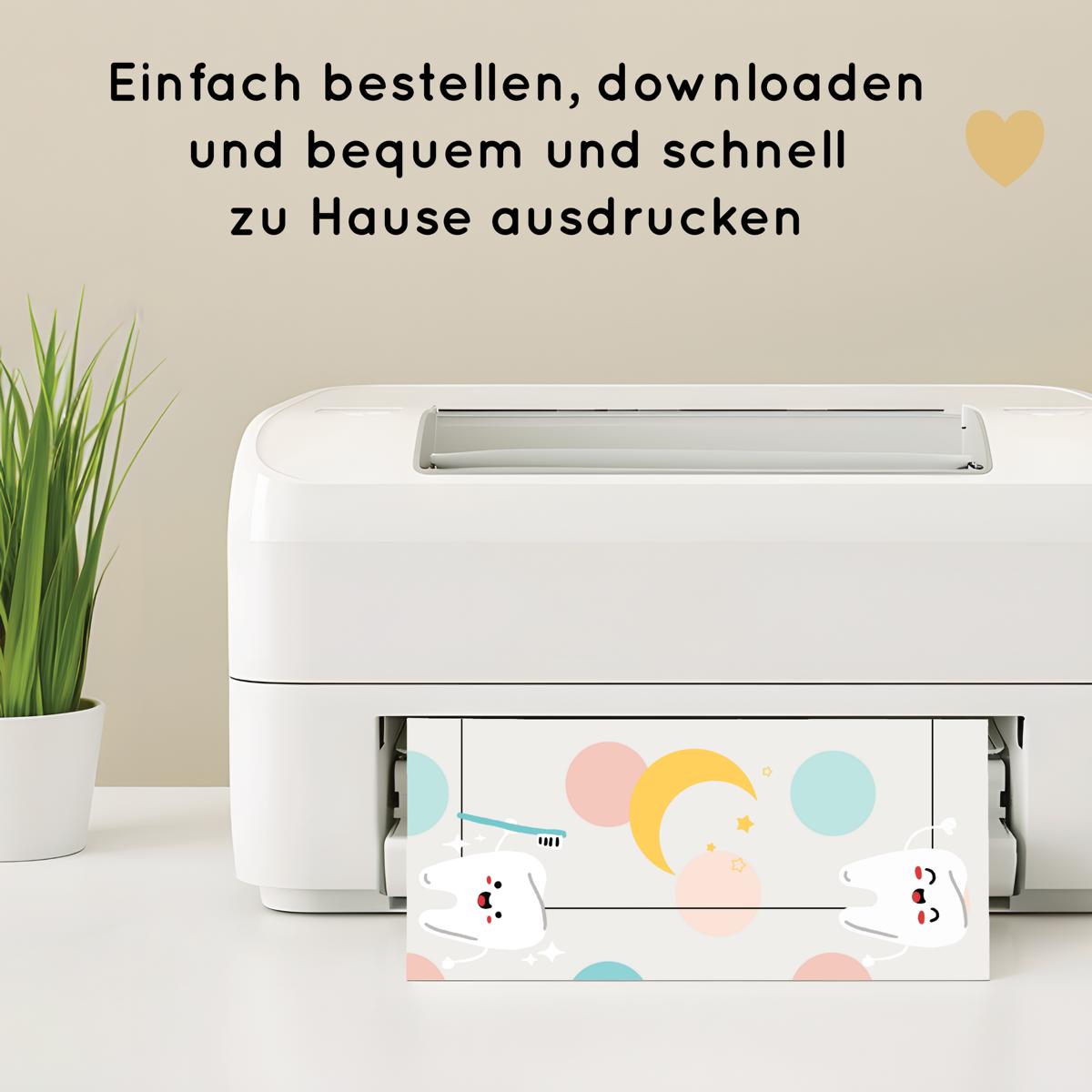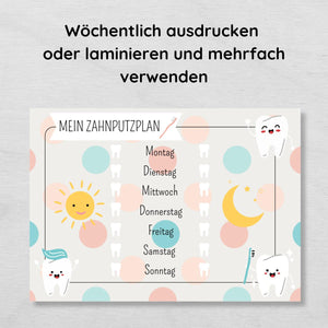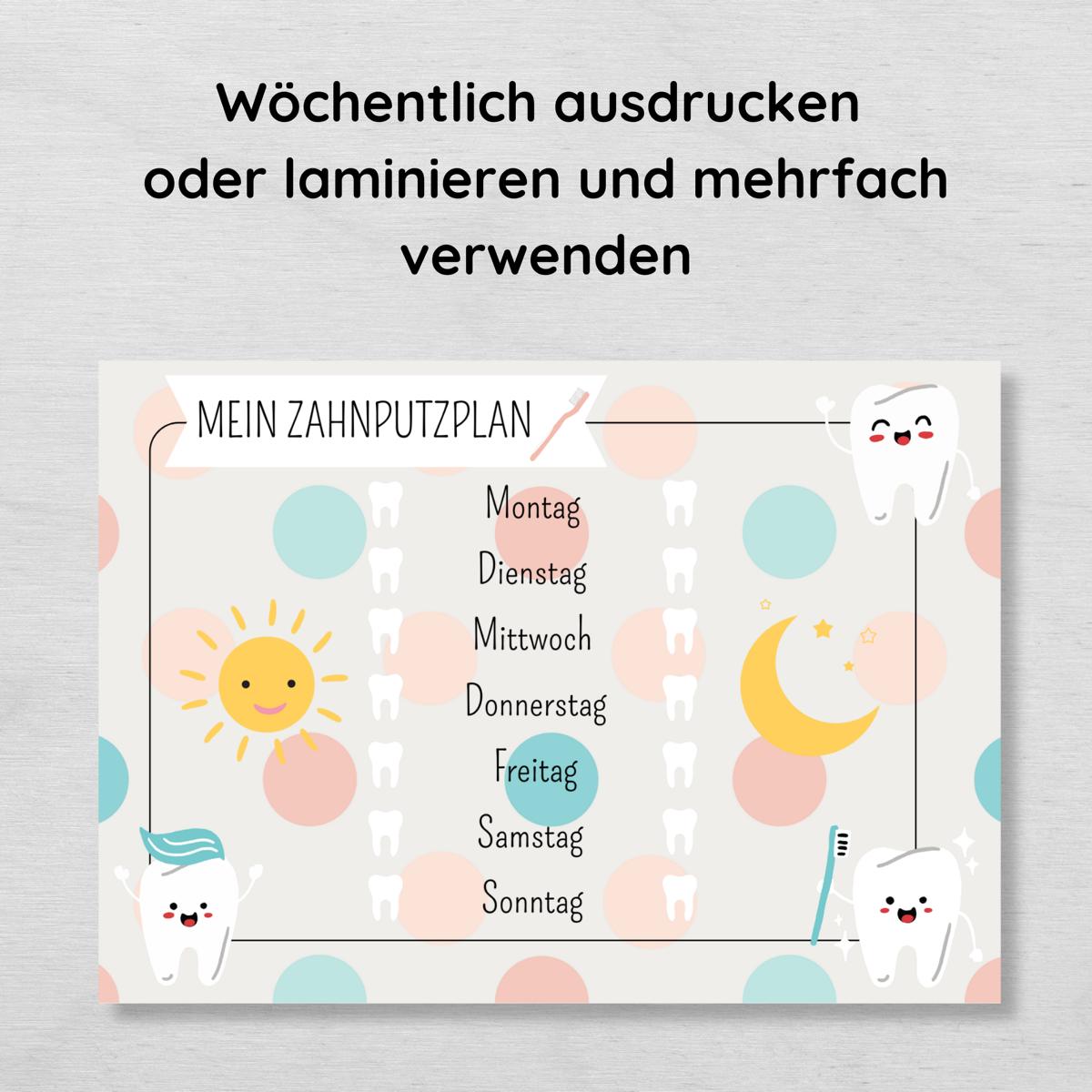 Der Zahnputzplan kann entweder wöchentlich ausgedruckt, in eine Klarsichtfolie gesteckt oder laminiert werden.